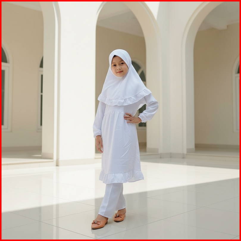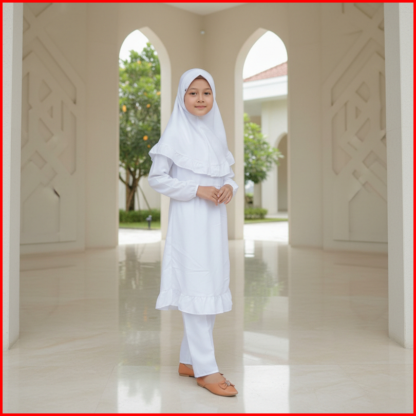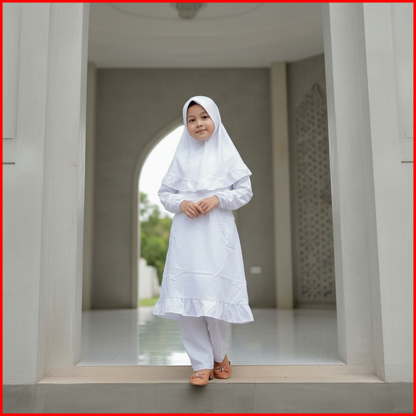 Setelan Baju Putih Manasik Haji Anak Perempuan Set Bergo 1-9 Tahun Gamis Putih Set Jilbab