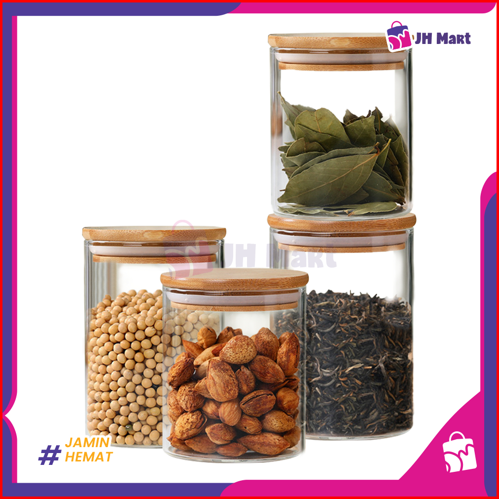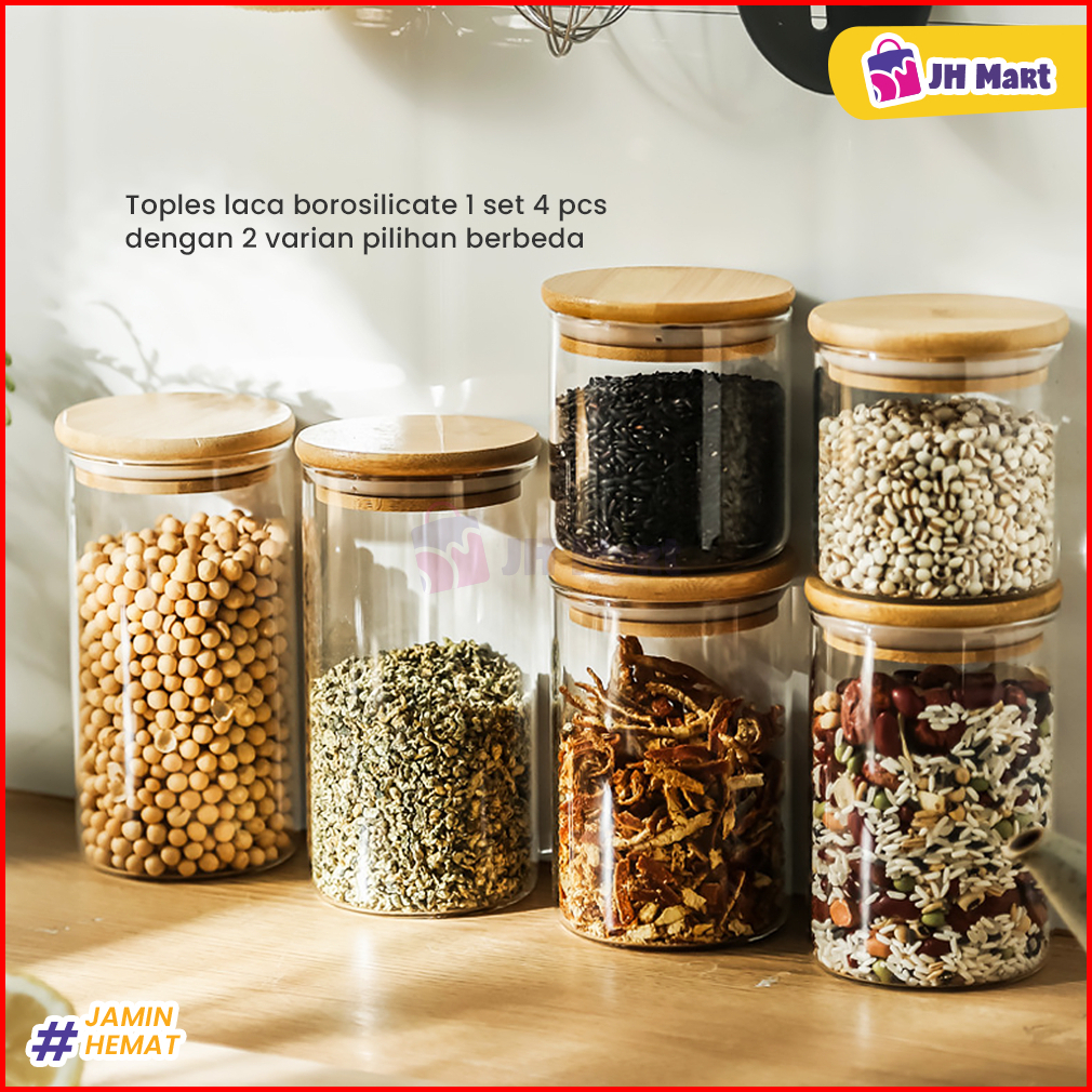 Jhm - Toples Kaca Aesthetic Bening Set 4 Pcs Tutup Kayu Bambu Wadah Makanan