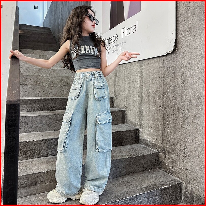 Cargo Highwaist Jeans Anak Perempuan Usia 7-12 Tahun