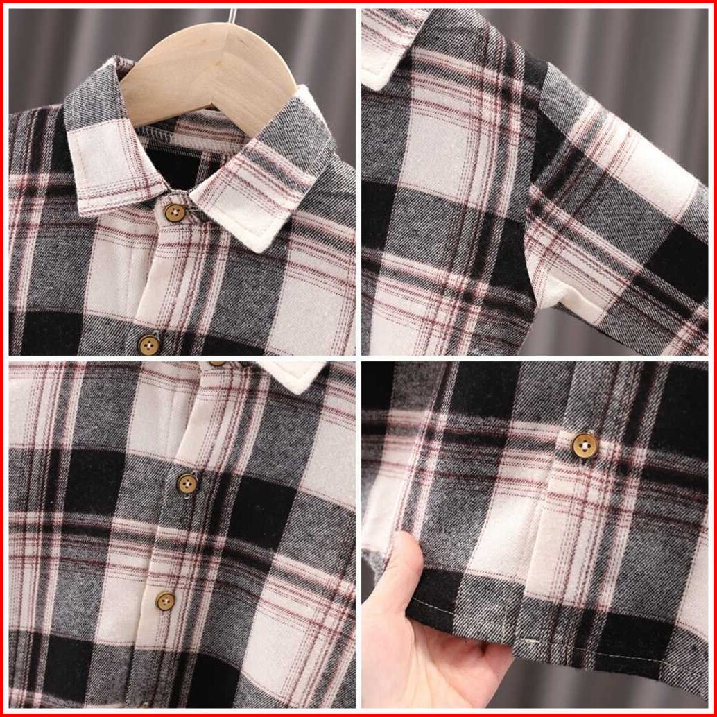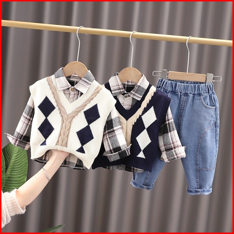 Kidsfo-3 Setelan Set Anak Laki Vest Rompi Rajut Kemeja Kotak Celana Cotton Panjang