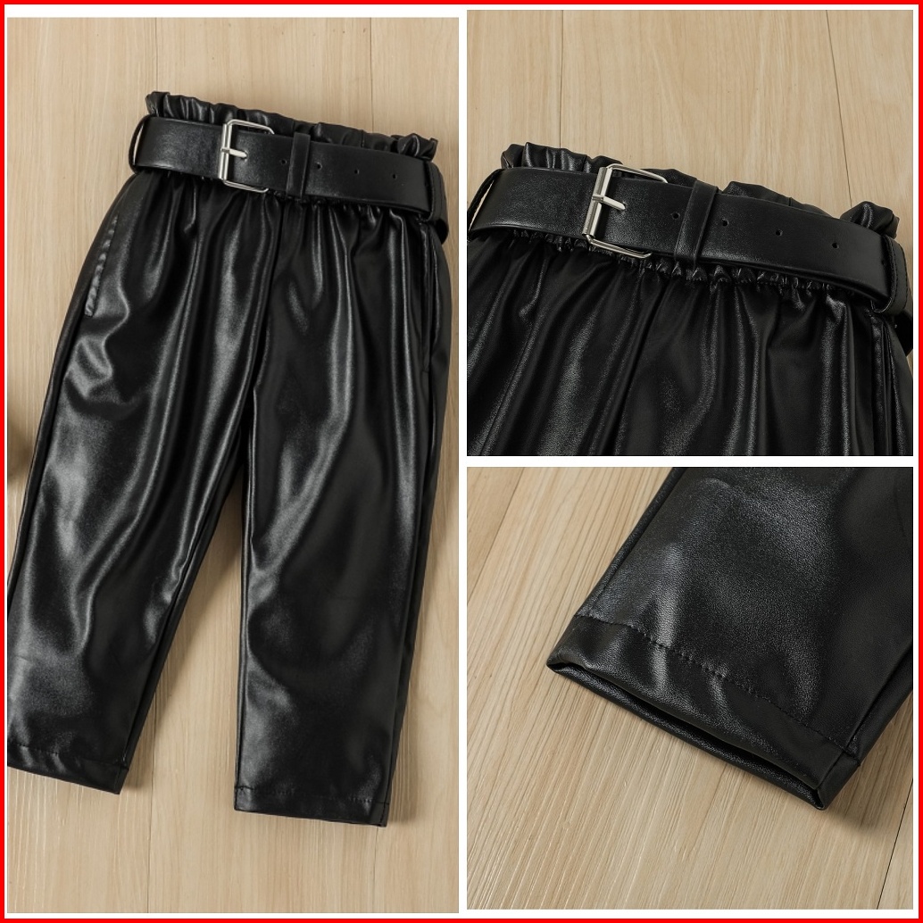Kidsfo-48 Setelan Set Baju Anak Korea Perempuan Kaos Atasan Rajut Celana Panjang Kulit Hitam