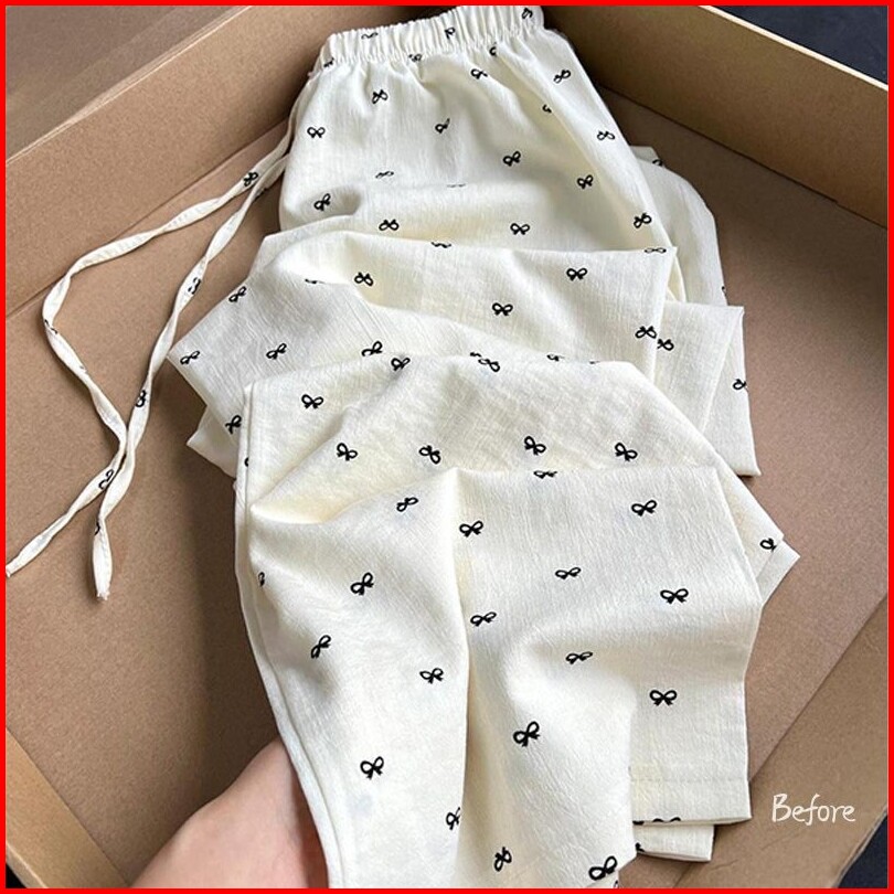 Celana Kasual Motif Pita Celana Kaki Lebar Tali Serut Celana Kaki Lurus Longgar Wanita Bf