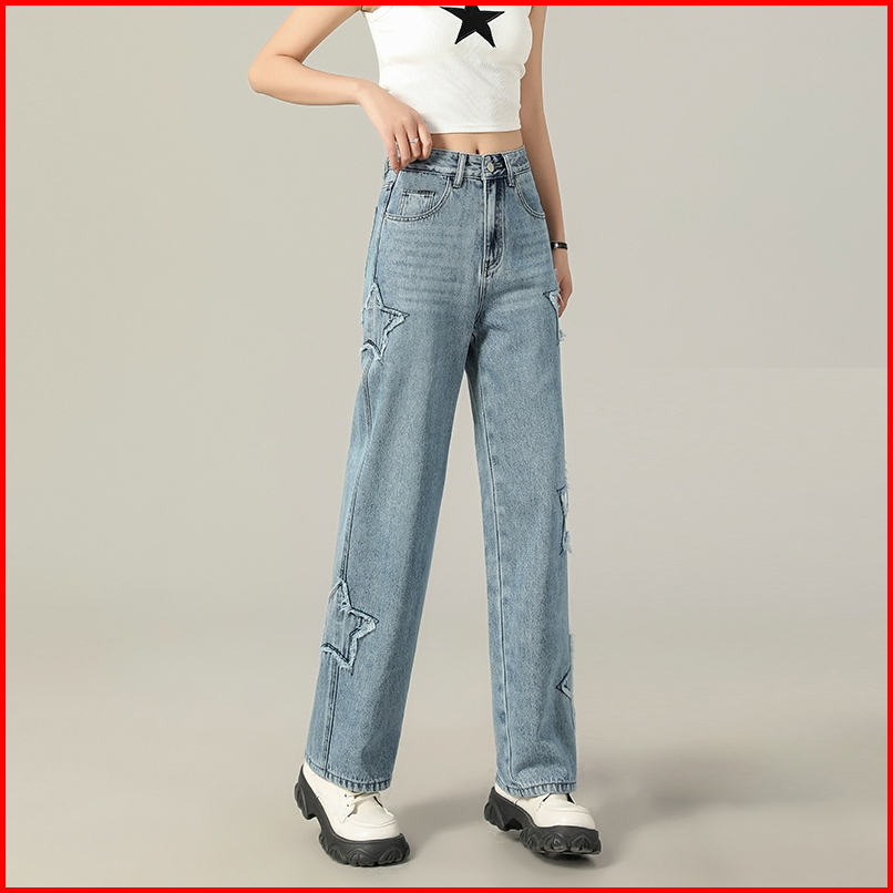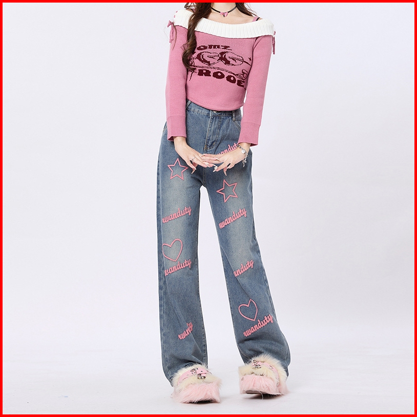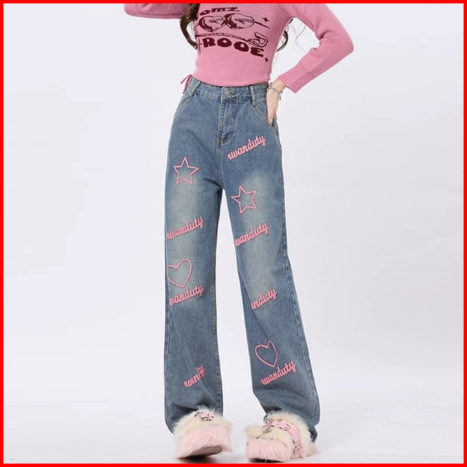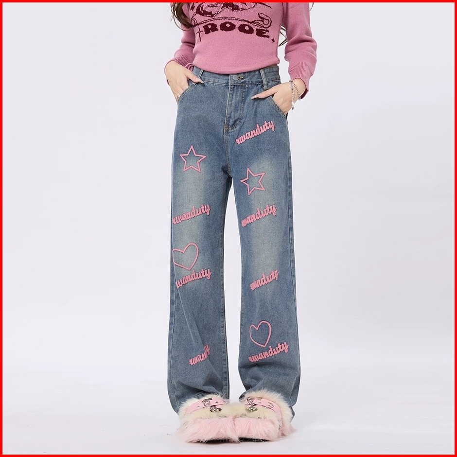 Veegirl Celana Jeans Wanita High Waist Wide Leg Bordir Love Star Y2k Korean Style Celana Denim Kekinian