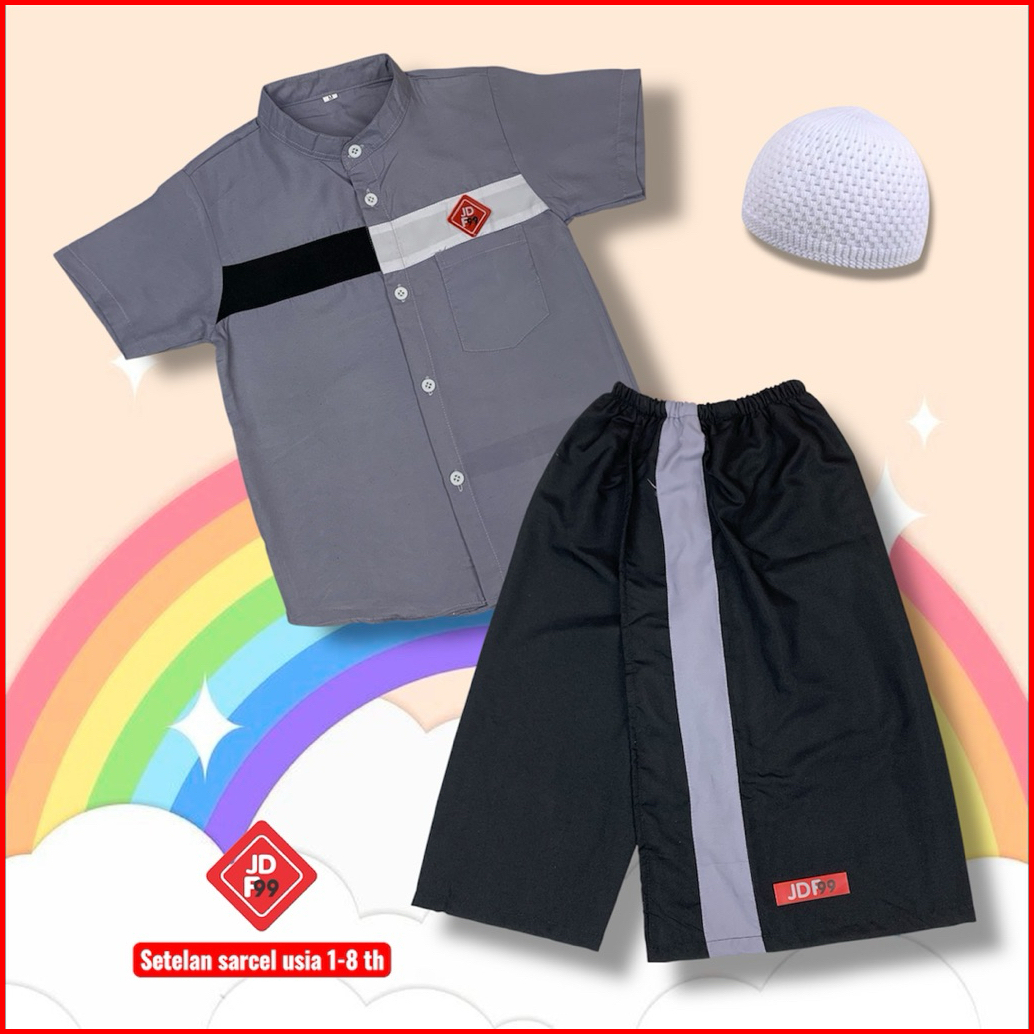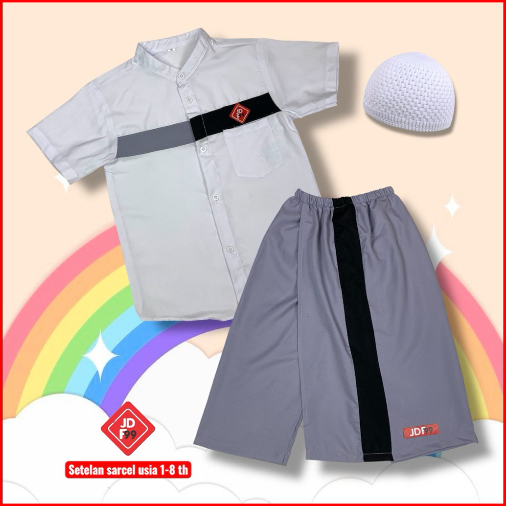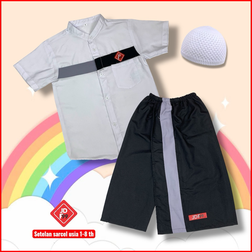 Jdf Kids Terbaru Baju Koko Set Sarcel Anak Usia 2-8tahun Sarung Celana Baju Koko Peci Ukuran M L Xl Xxl Hitam Putih Abu
