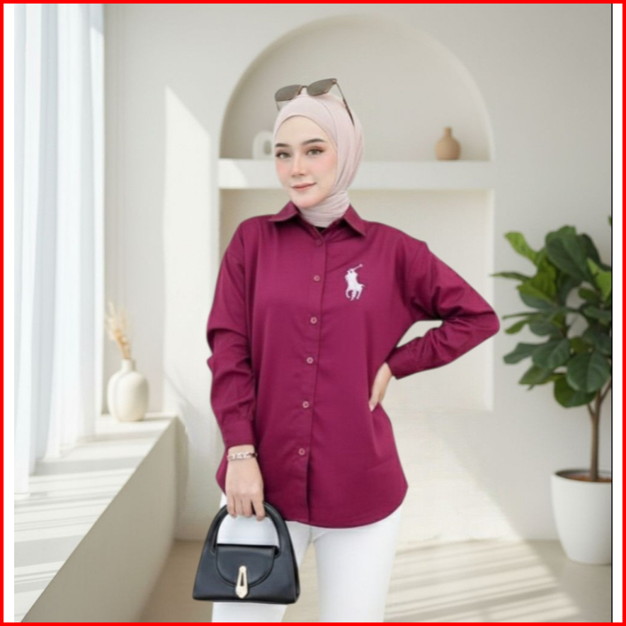 Kemeja Bordir Polo Wanita Katun Polos Lengan Panjang Casual Formal Jumbo