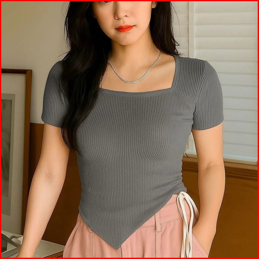 Crop Top Wanita Korean Style Rib Adem Serut Crop Top Square Neck Tali Serut Samping Lengan Pendek Crop Top Pakaian Wanit