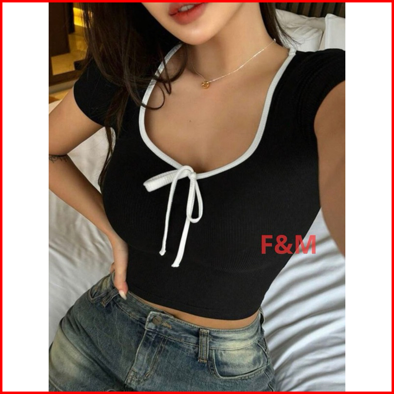 Elnora Officiall Croptop Baju Crop Kaos Cropkerah Bulat Model Pita Fashion Korea Ket.254 Baju Wanita Premiumc
