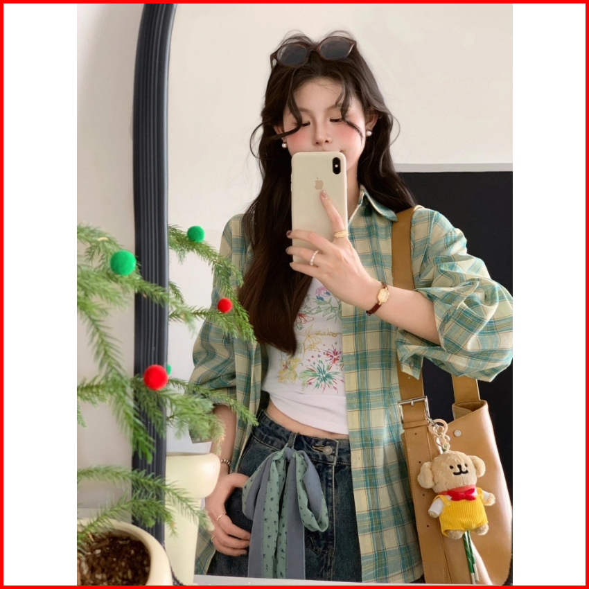 2toyoung Kemeja Kotak-kotak Hijau Wanita Musim Panas Kemeja Wanita Atasan Wanita Korea Style Blouse Korean Style