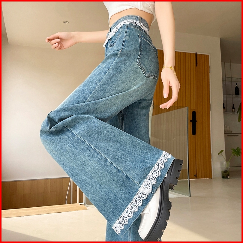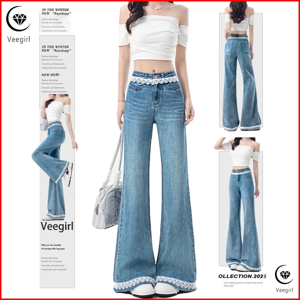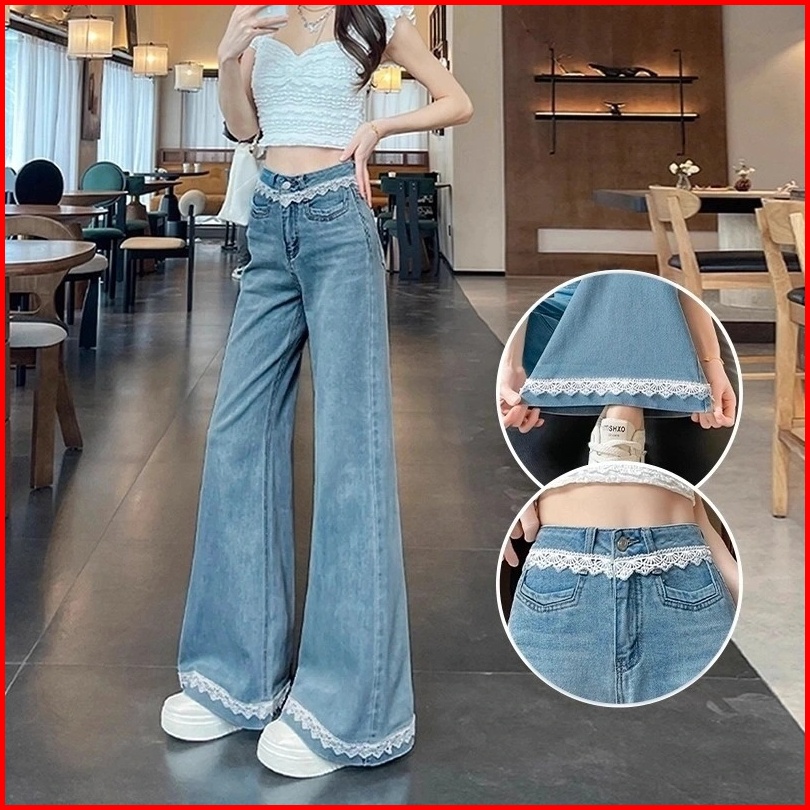 Veegirl Celana Jeans Wanita High Waist Wide Leg Korean Style Model Flare Cut Dengan Detail Lace Trend Fashion Kekinian