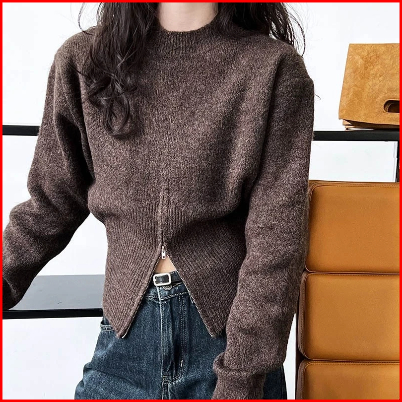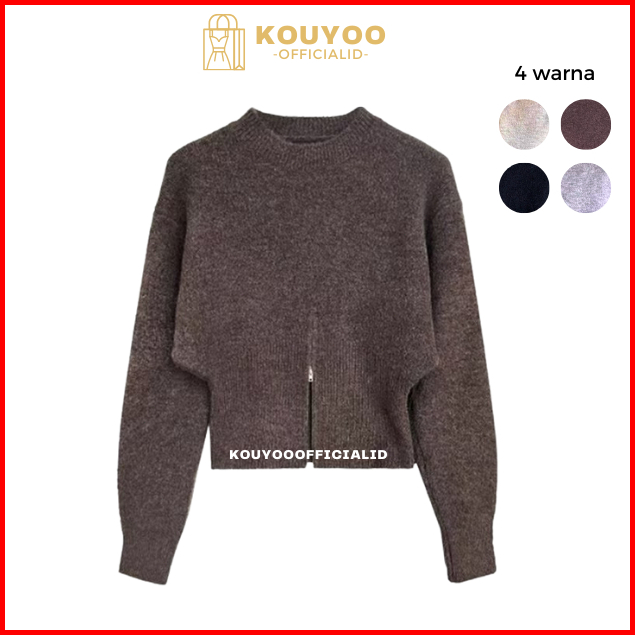 Kouyoo Rajut Serbaguna Sweater Warna Solid Pakaian Rajut Longgar Ritsleting Wanita Lengan Panjang