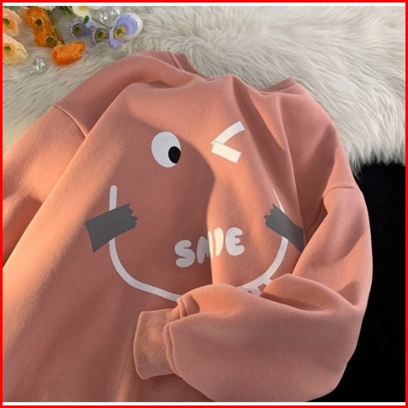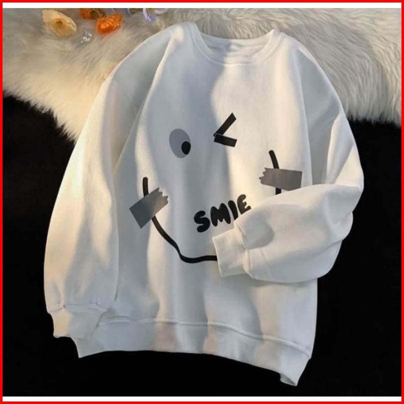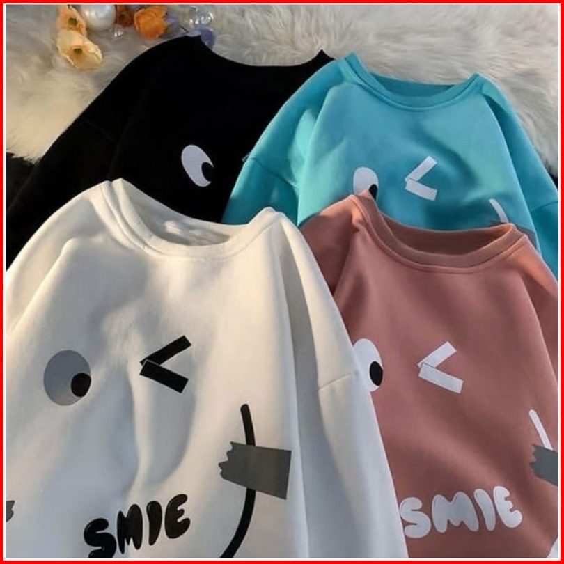 Crewneck Sweater Basic Oblong Wanita - Emote Smile Sweatshirt Pakaian Oblong - Sweater