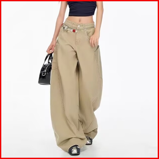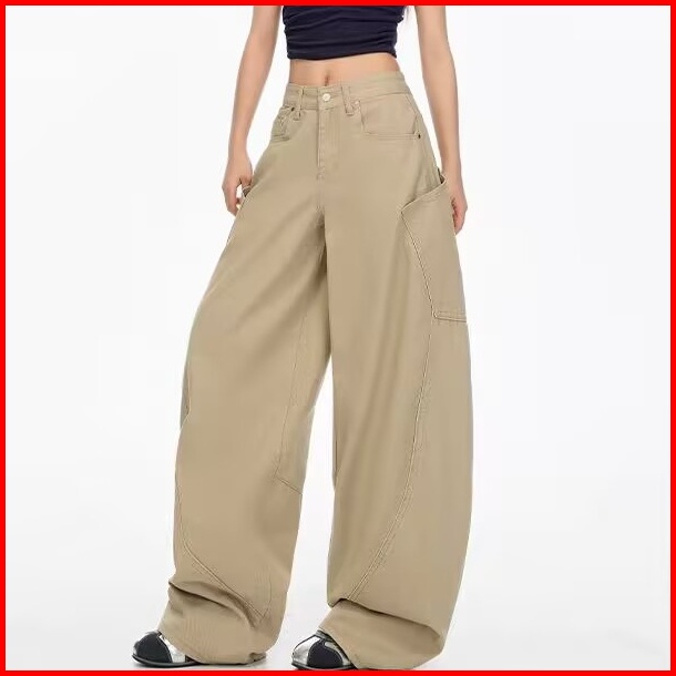 Jeans Wanita Ukuran Besar Gaya Korea Celana Jeans Longgar Berkaki Lebar Celana Jeans Khaki