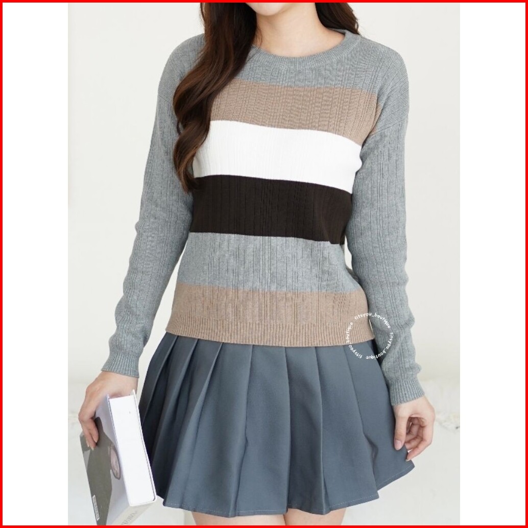 Panna Knit Tops Baju Wanita Tangan Panjang Salur Knitwear Sweater Atasan Rajut Katun Adem