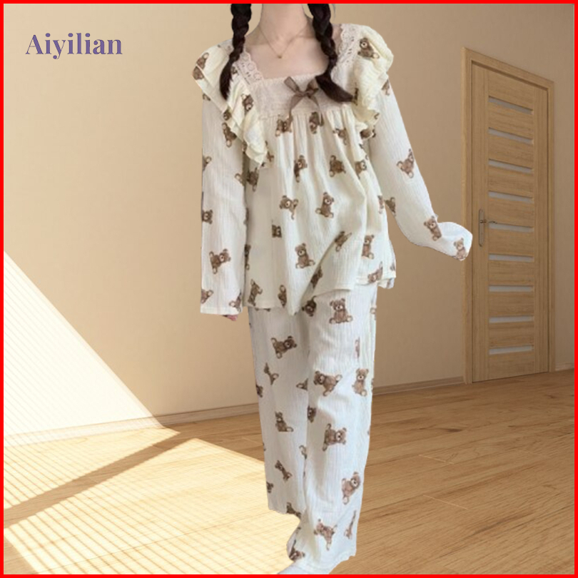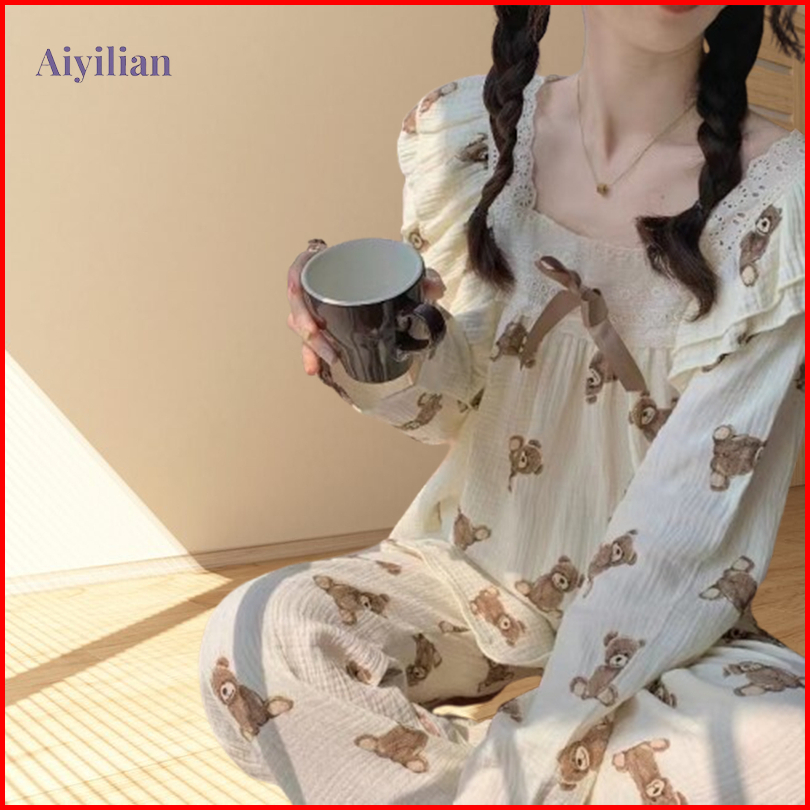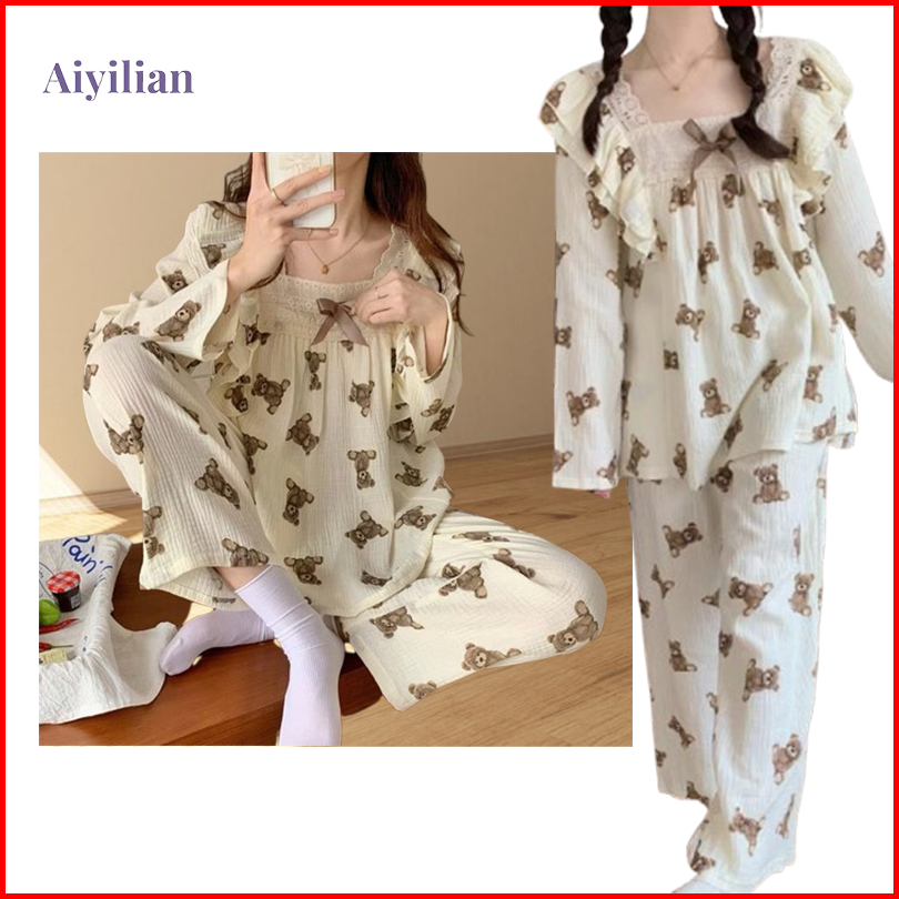 Aiyilian Piyama Tidur Wanita Lengan Panjang Motif Beruang Dengan Ruffle Lace Premium Lembut B02