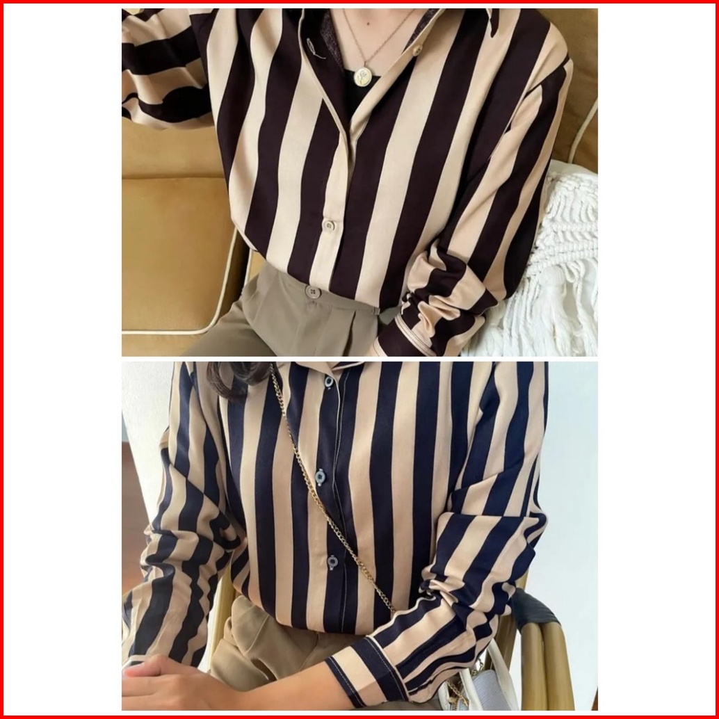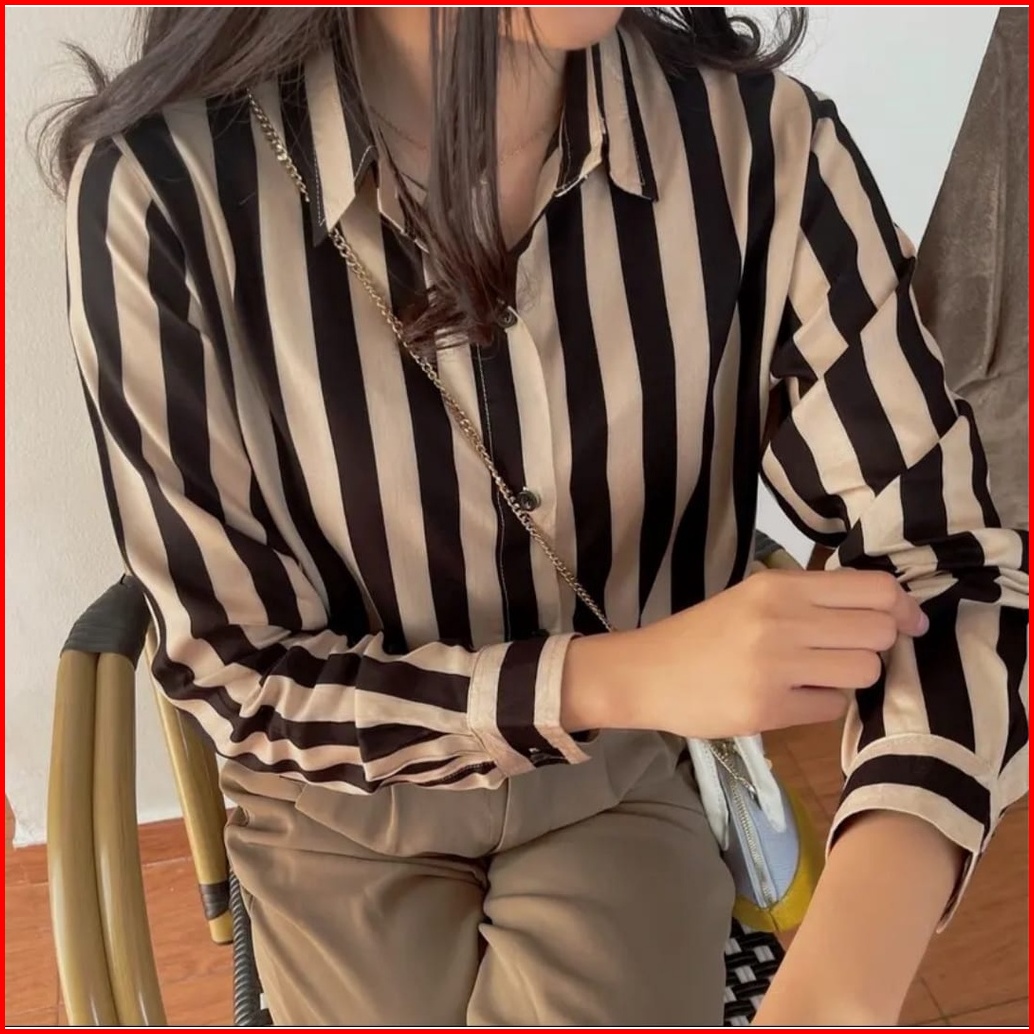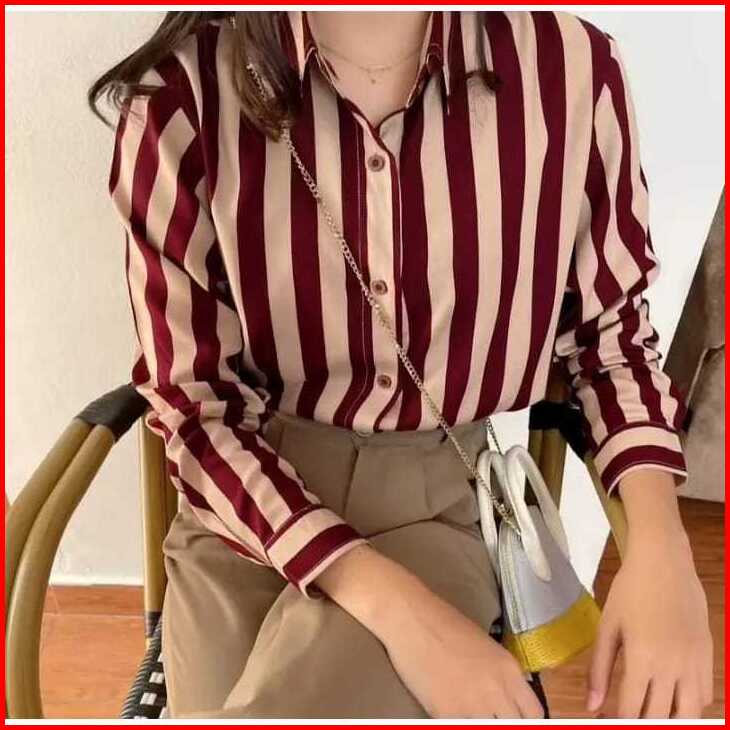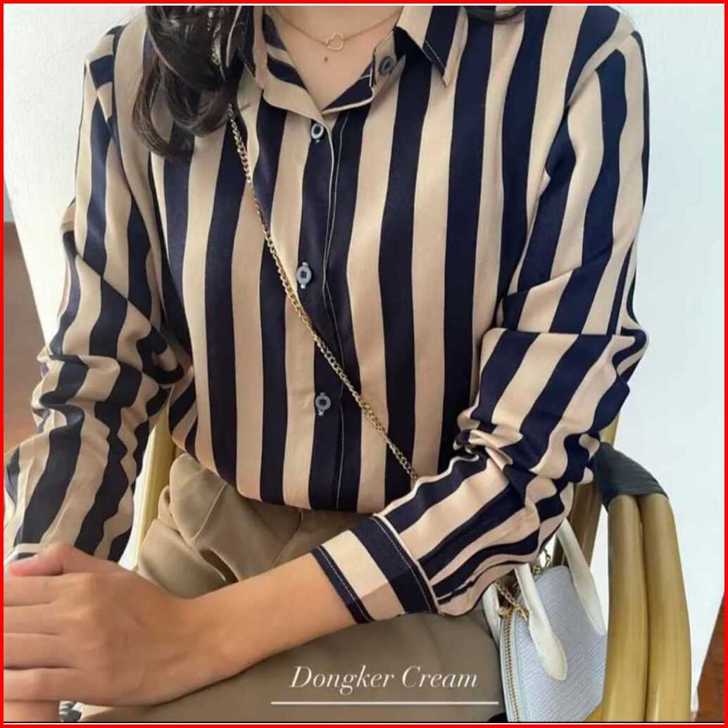 Kemeja Salur Wanita Jumbo Lengan Panjang Atasan Setrip Masa Kini 2024 Bahan Katun Premium Ld 90-125