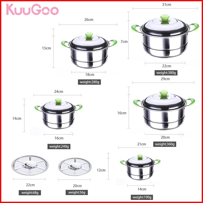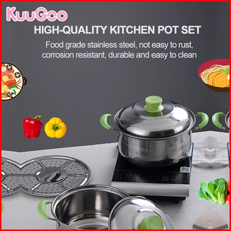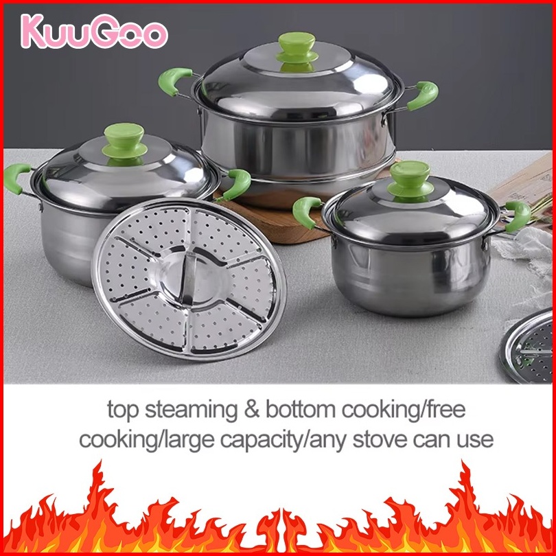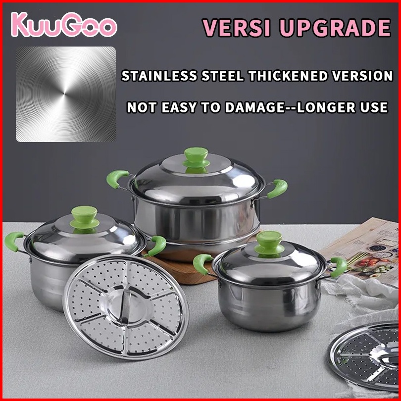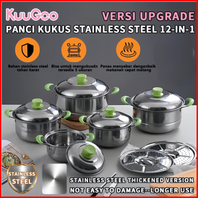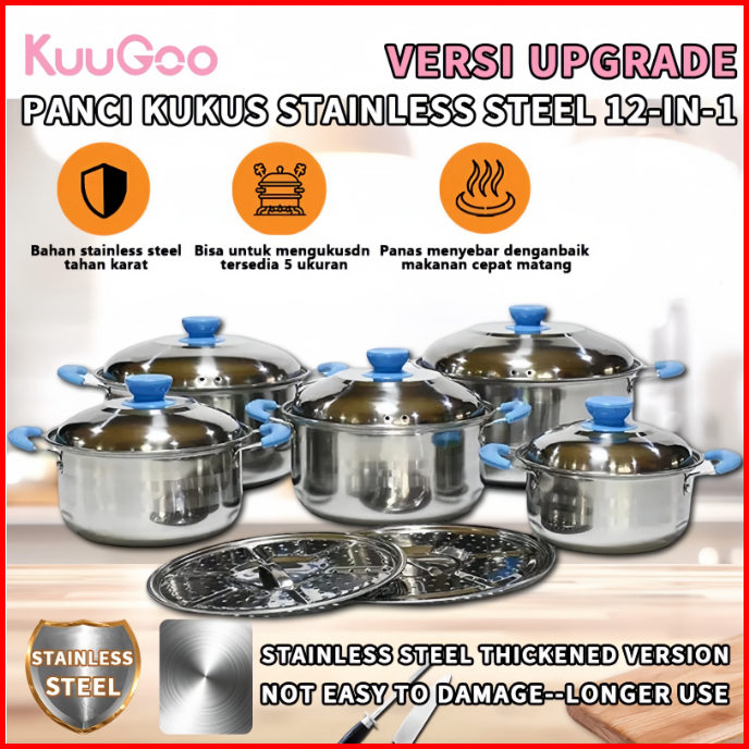 Kuugoo 12in1 Upgraded Panci Steamer Set Stainless Isi 5 Pcs 2pcs Kukusan Panci Bahan Tebal Premium Panci Stainless Set T