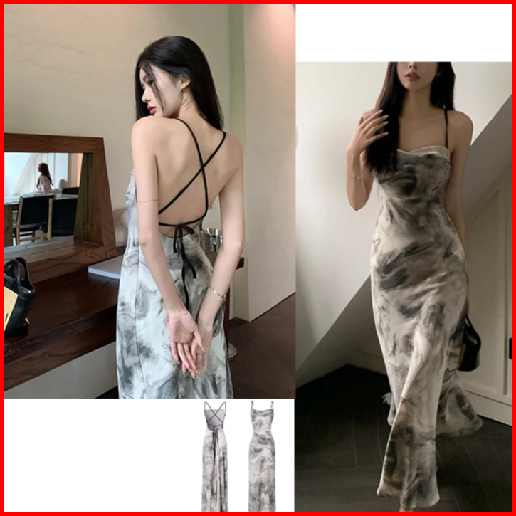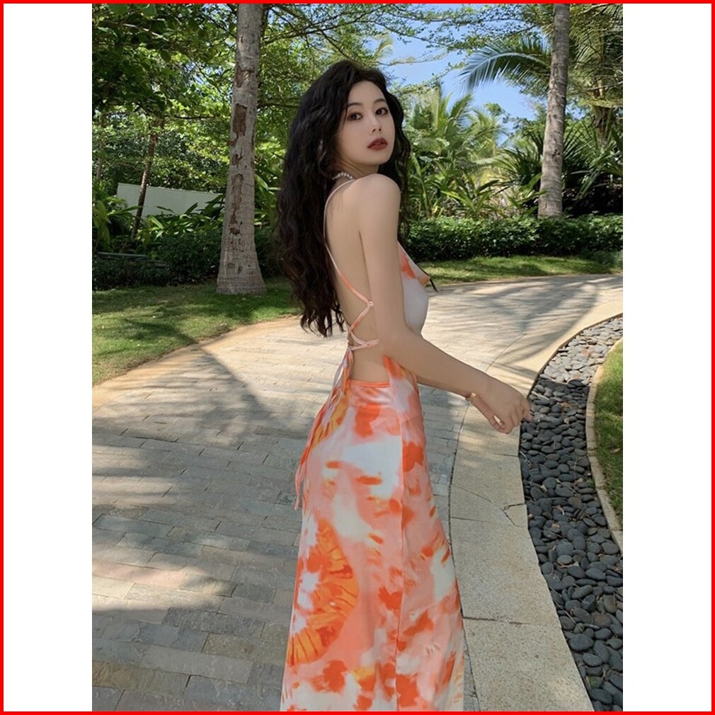 Baju Summer Flowy Long Dress Orange Halter Backless Floral Vintage Gaun Pantai Wanita Kekinian Pesta Hijab Korean Style