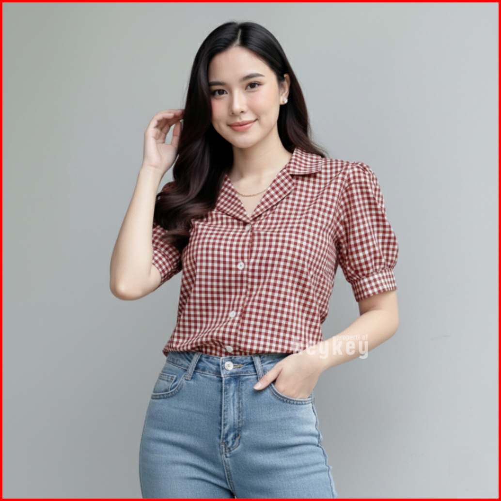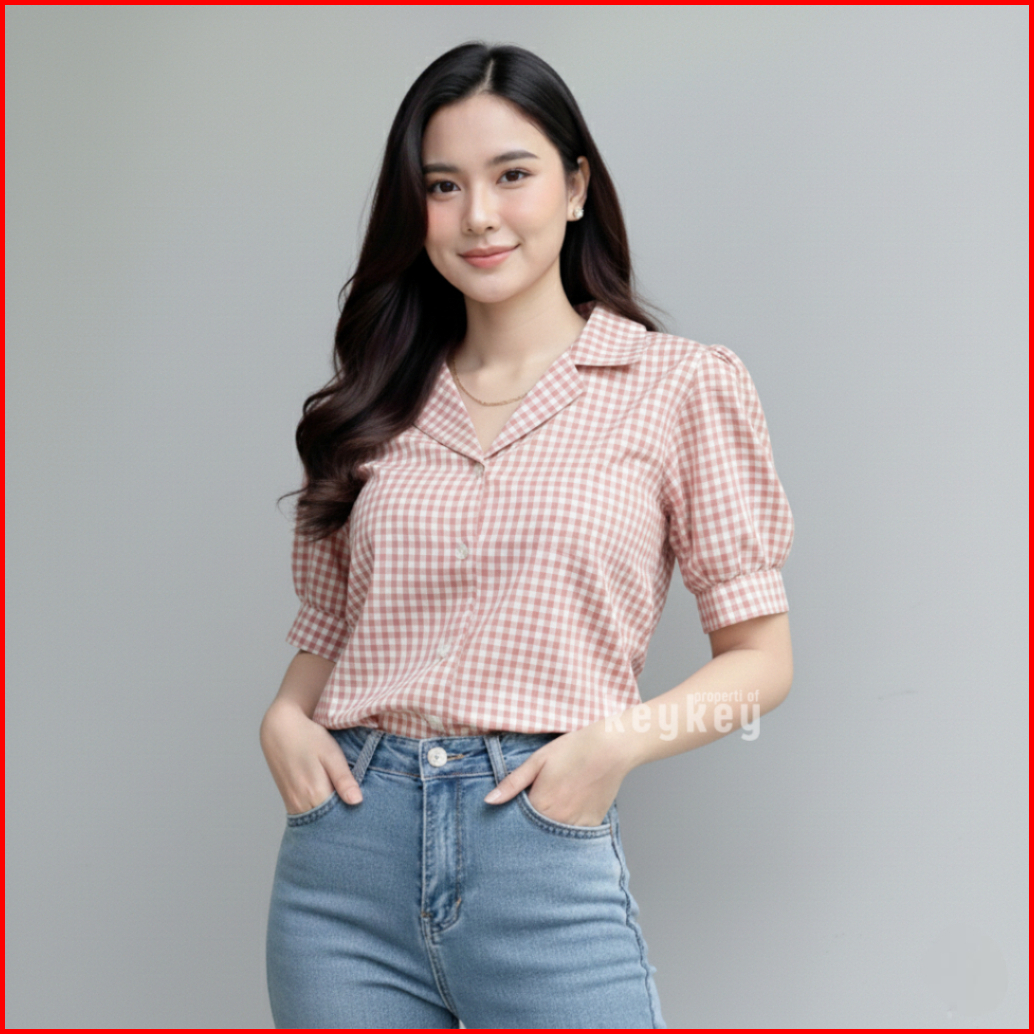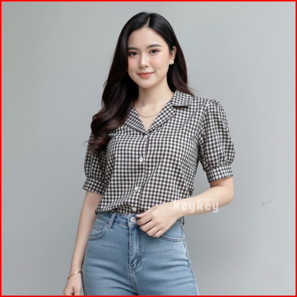 Vanessa Kemeja Wanita Motif Kotak Katun Poly Pe Lengan Pendek Atasan Kemeja Casual Kekinian