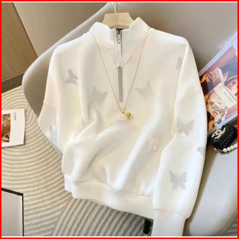 Atasan Wanita Sweatshirt Kupu-kupu Korean Style Lengan Panjang Oversize Zip Up Top Putih