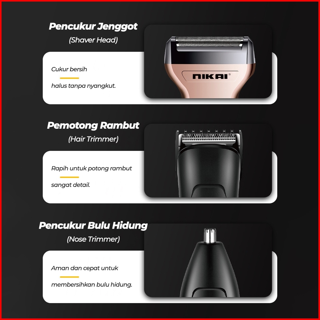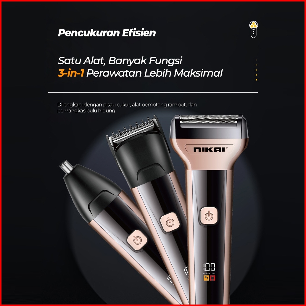 Nikai N-7582 Set 3 In 1 Man Grooming Kit Perlengkapan Alat Cukur Rambut Hidung Jenggot Pria Listrik Portable