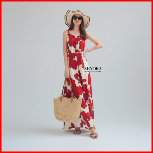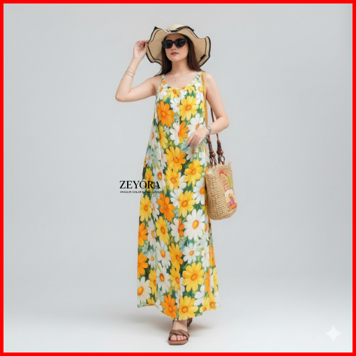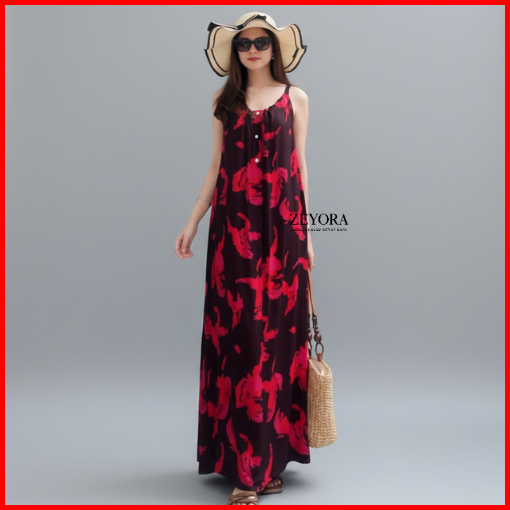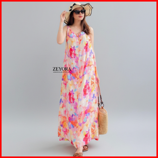 Dress Alyssa Tanpa Lengan Wanita Rayon Viscose Long Dress Pantai Wanita Motif Model Tali Satu