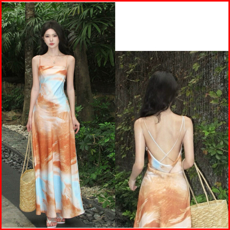 Midi Dress Terbaru 2025 Baju Bohemian Style Wanita Beach Korean Long Orange Floral Halter Backless Summer Prom Dress Pan