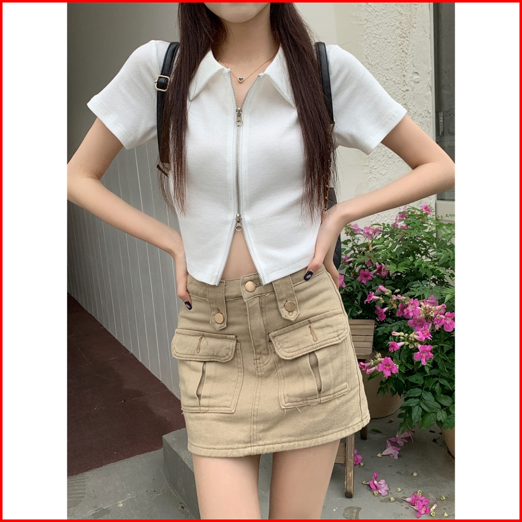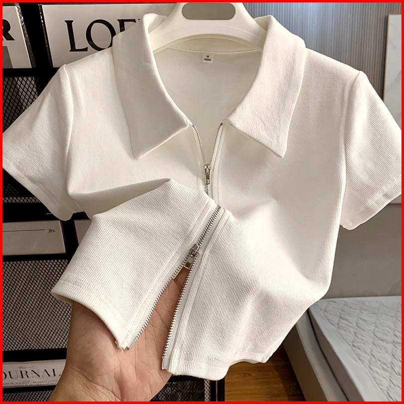 Xiaozhainv Crop Top Lengan Pendek Kaos Wanita Crop Top Kardigan Warna Solid Abu-abu Baju Atasan Wanita Terbaru Crop Top