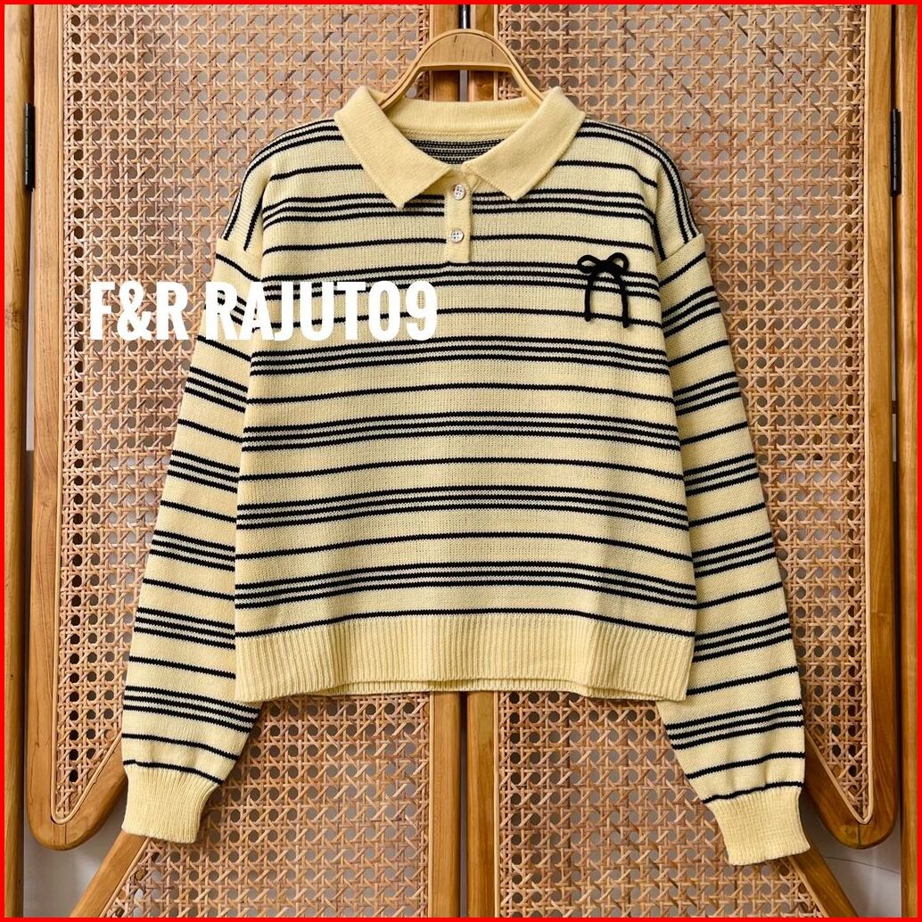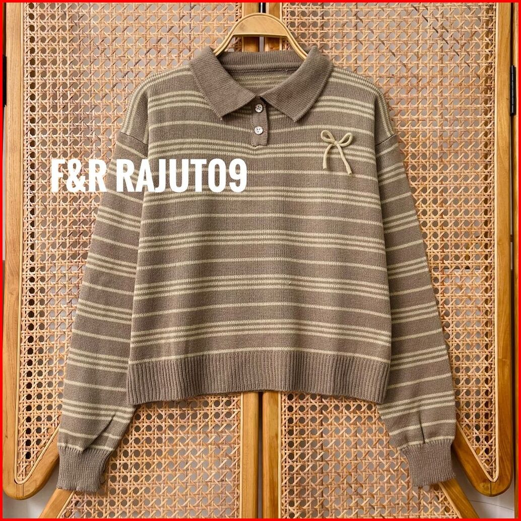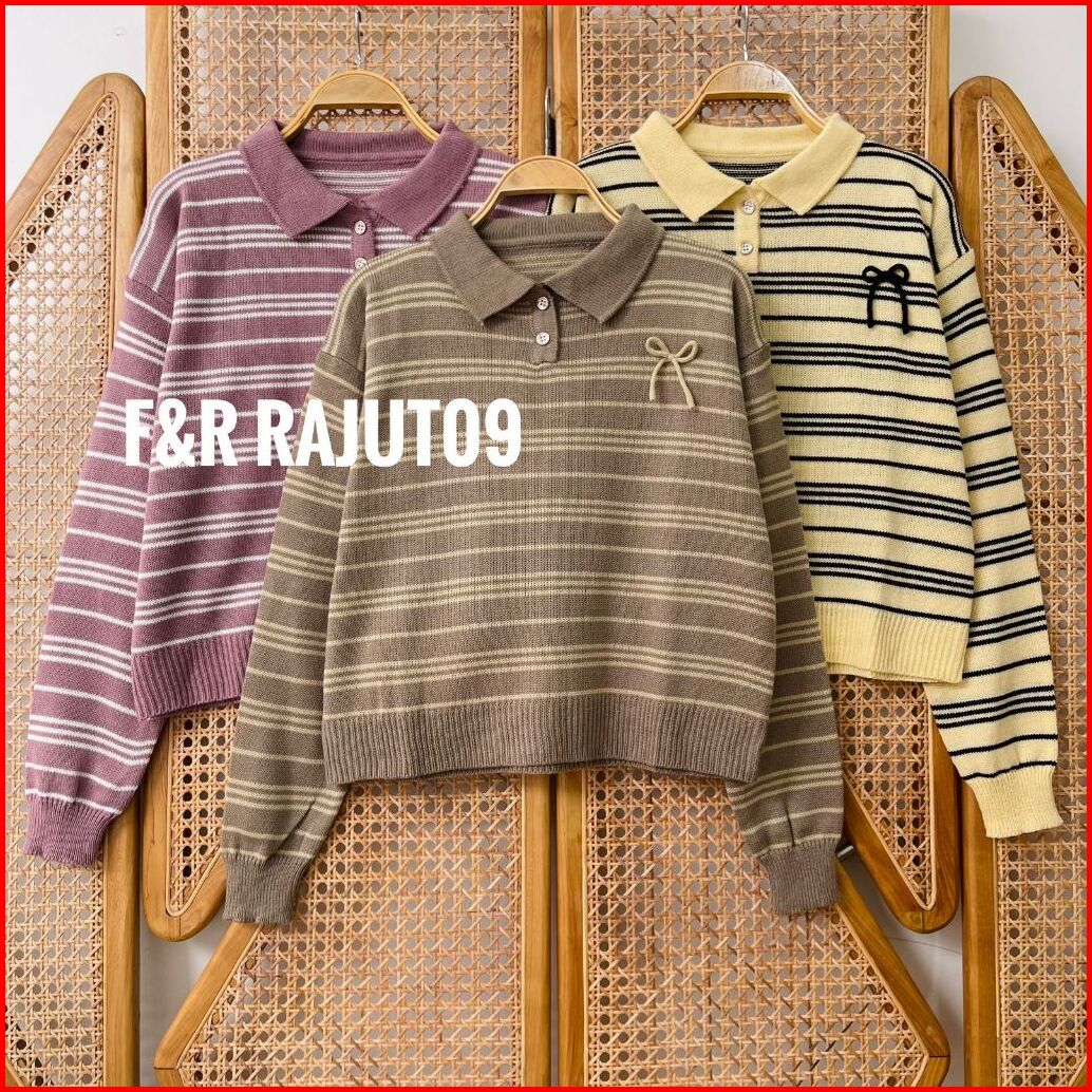 F R Muhasi Blouse Knit - Atasan Sweater Rajut Wanit Berkerah Polo Motif Stripe Pita Tali Kur Lengan Panjang Korean Style