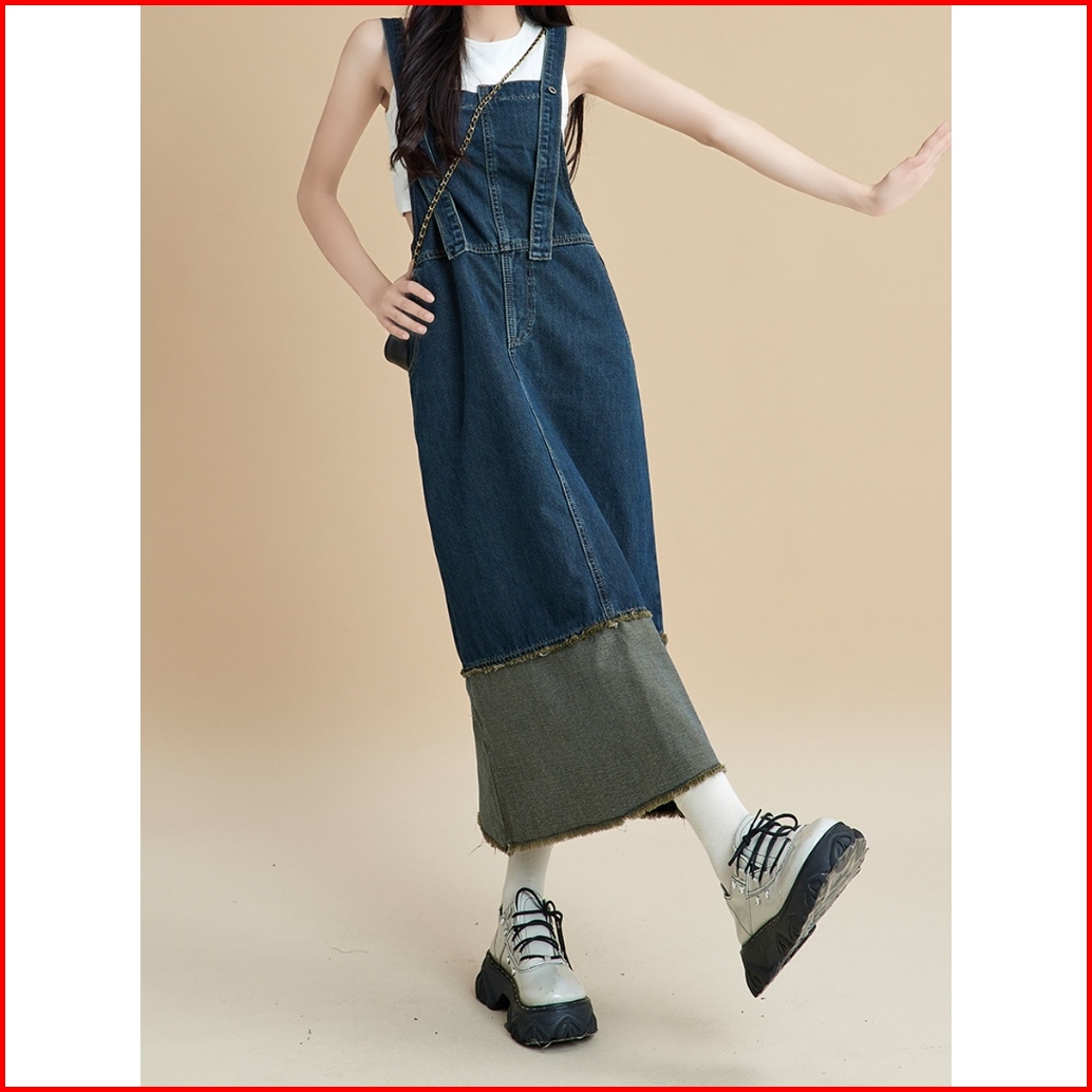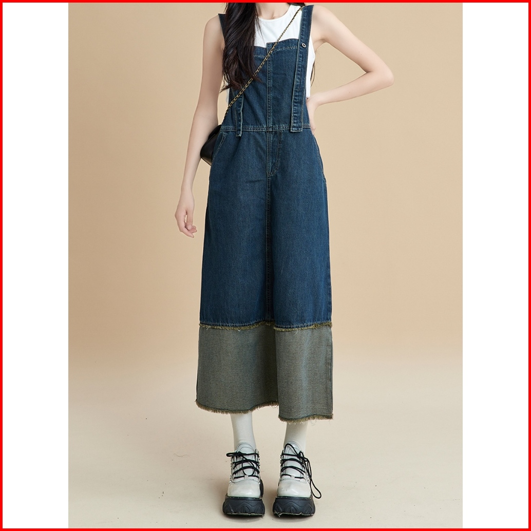 Rok Premium Cargo Jeans Span Korean Style Wanita Panjang Rok Lepis Suspender Denim Jahitan Warna Kontras Rok Span Pliske