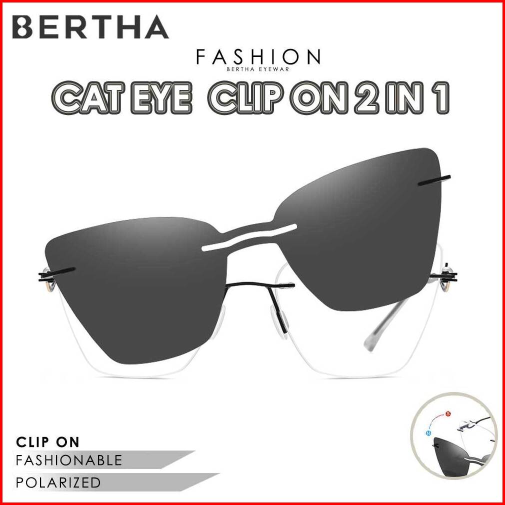 Bertha Kacamata Clip On 2in1 Free Lensa Clip Polarized Style Cat Eye Frameless Bahan Tr90 Metal Fashion Wanita Bisa Minu