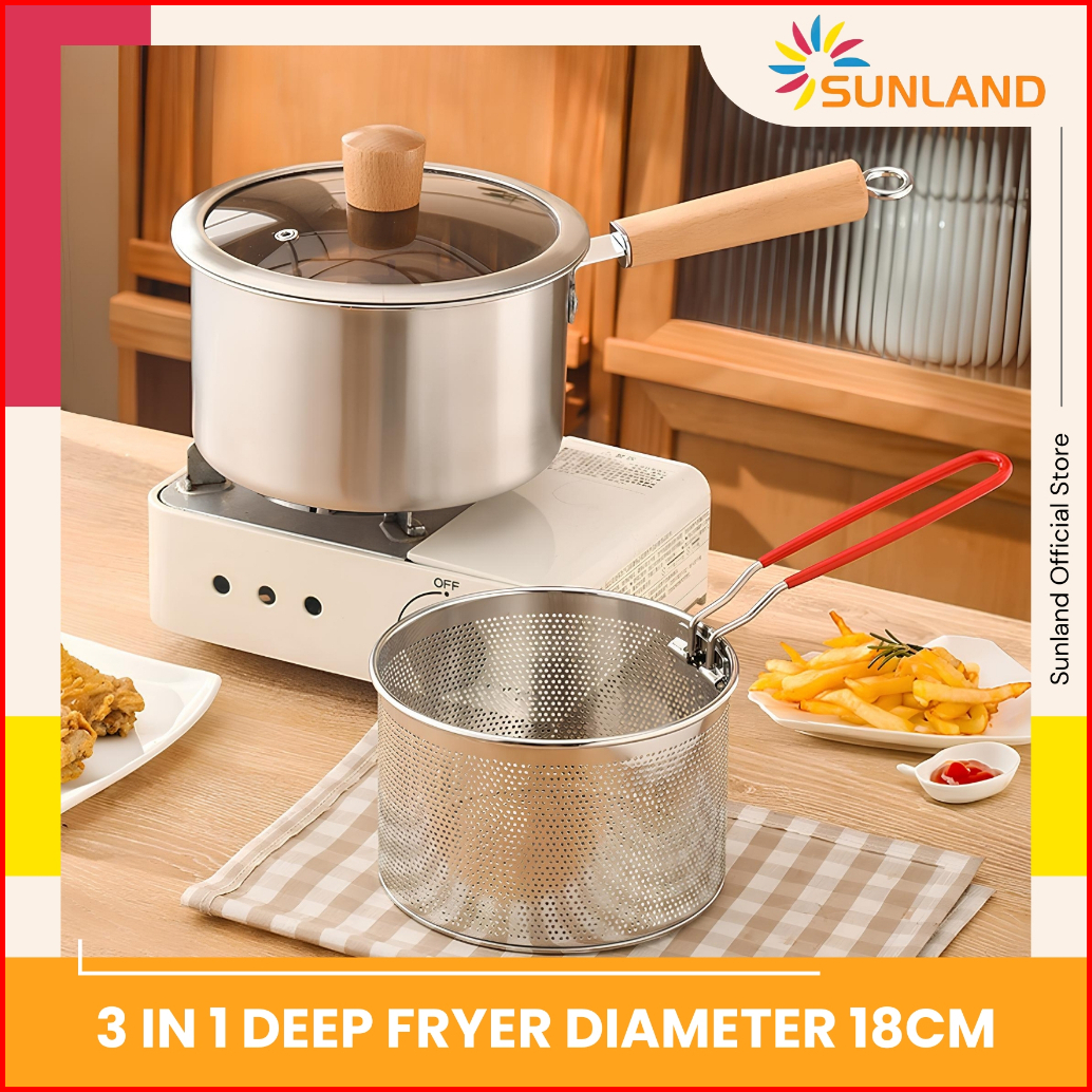 Sunland Panci Mie Rebus Stainless Steel Deep Fryer Set Penggorengan 18 Cm Saringan Tutup Kaca