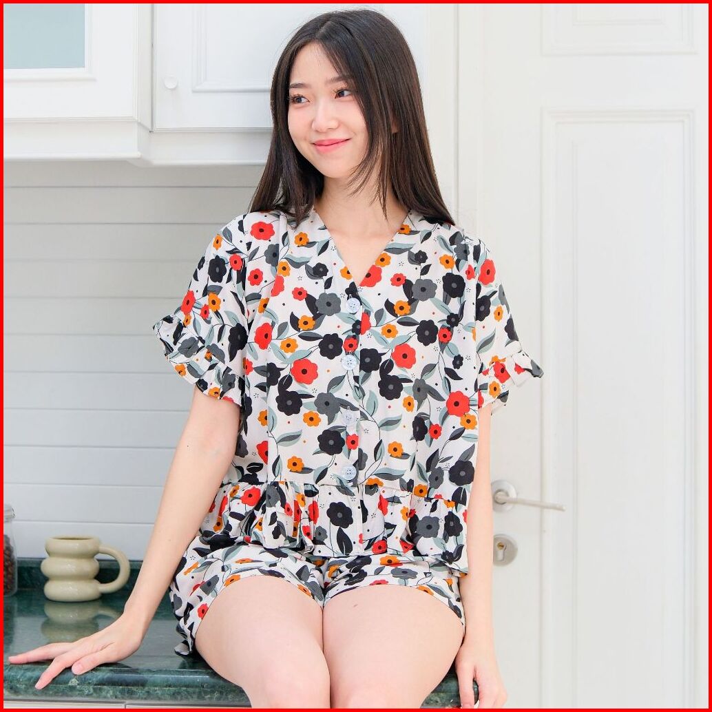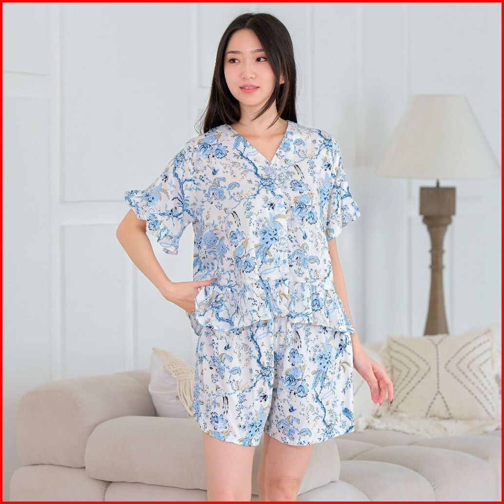 Aurae - Hellena Setelan Baju Tidur Wanita Lengan Pendek Celana Pendek Rayon Viscose Motif Bunga