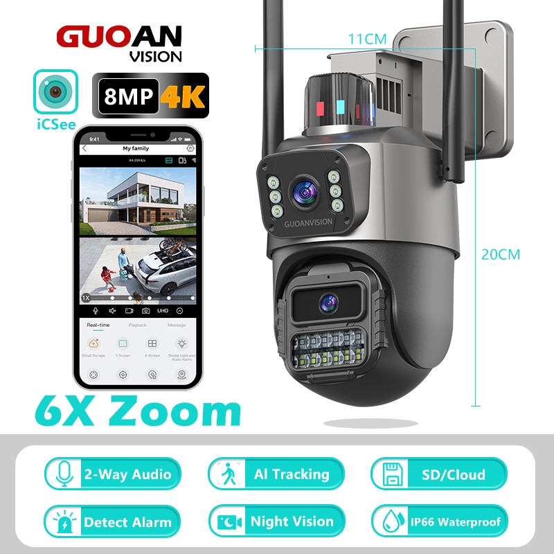 Guoanvision Kamera Cctv Hd 8Mp 6X Zoom Icsee Wireless Wifi Alarm Deteksi Gerakan Ip66 Waterproof Dual-Lensai Cctv Camera