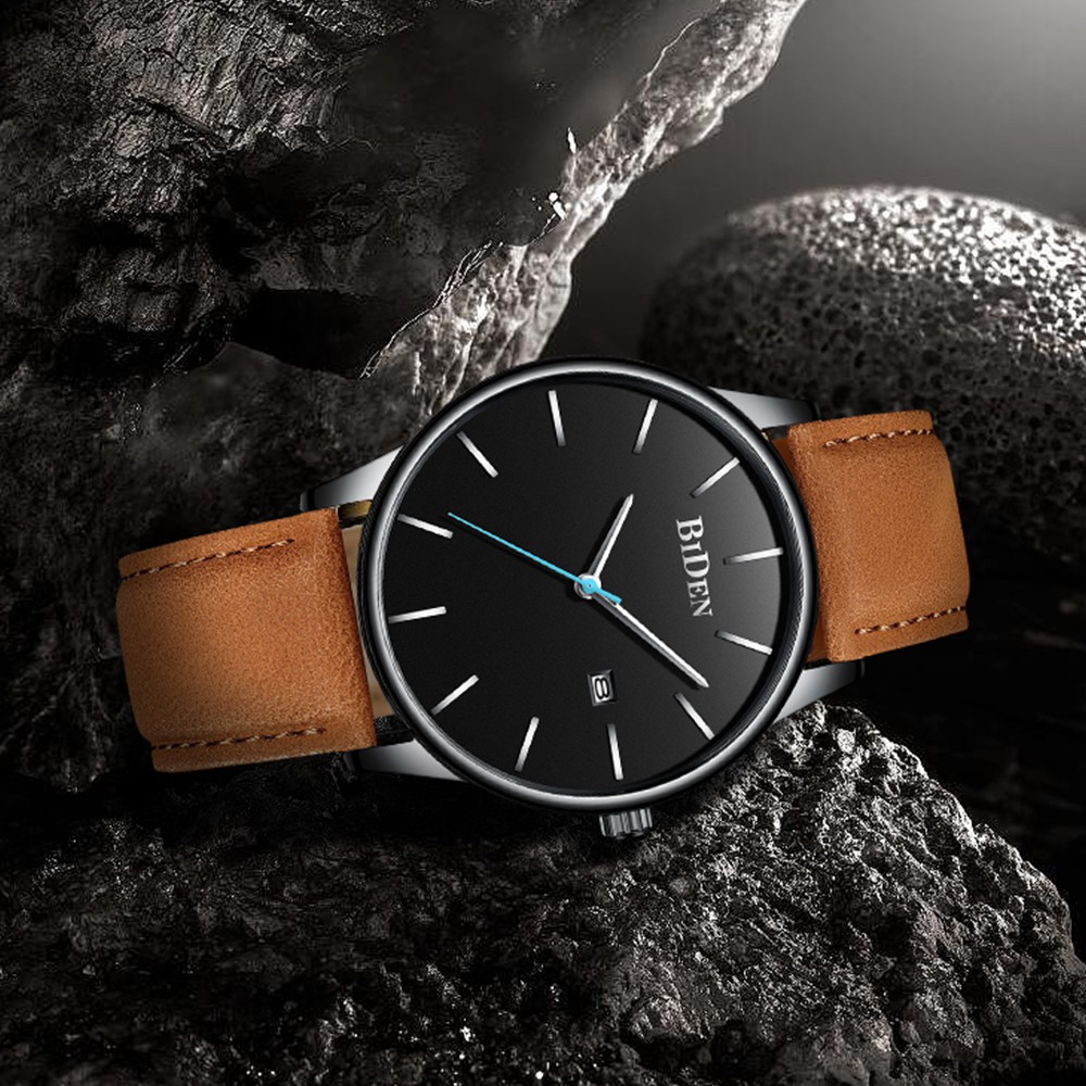 BIDEN Jam Tangan Pria Anti Air Santai Olahraga Kuarsa Jam Tali Kulit Otomatis Date Jam Tangan Cowok Original