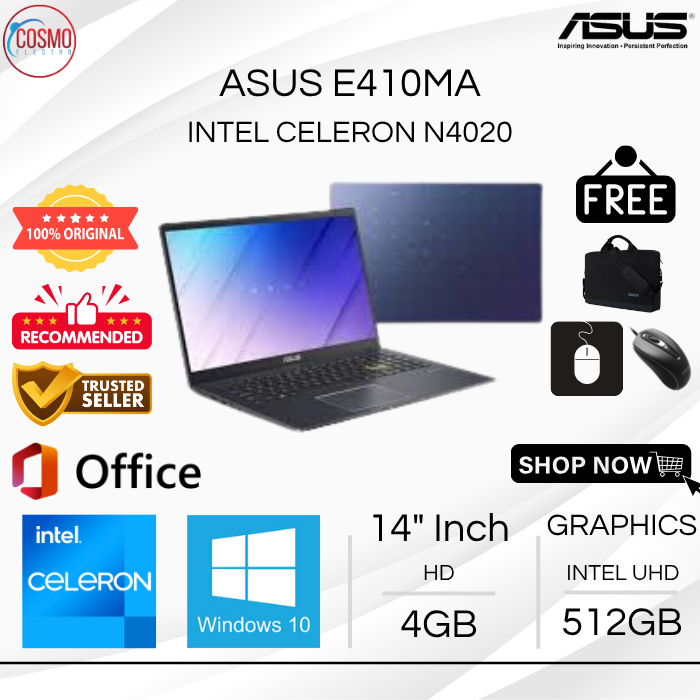 ASUS E410MA INTEL CELERON N4020 | 4GB RAM 512GB SSD | 14 INCH WINDOWS 10 - BONUS TAS LAPTOP, MOUSE, MOUSE PAD