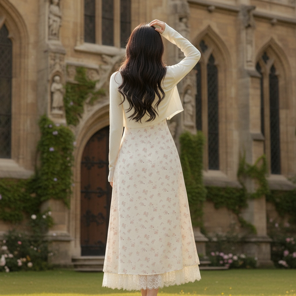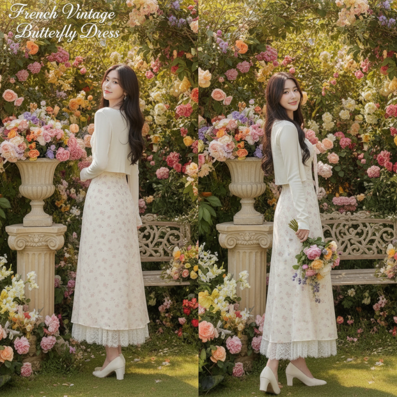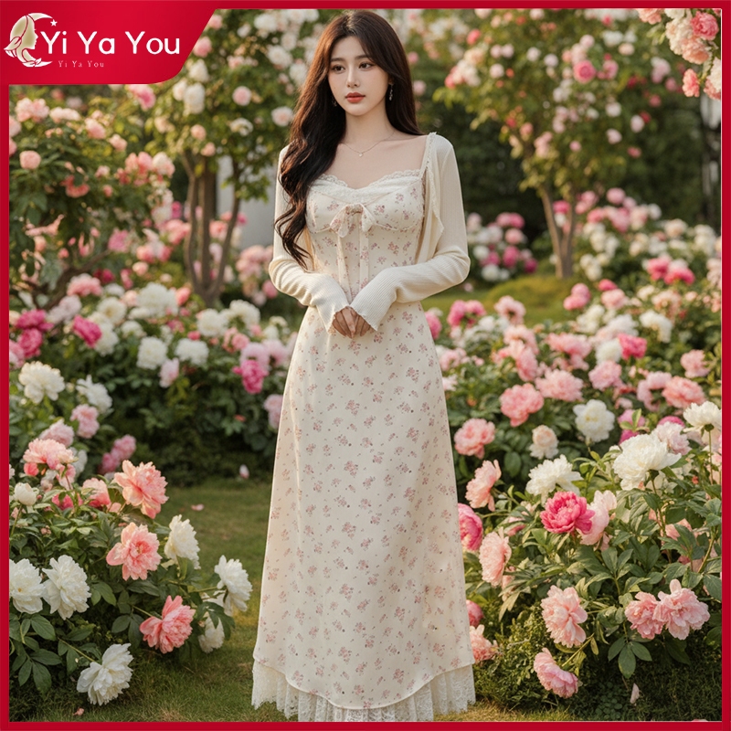 SETELAN LONG DRESS FLORAL VINTAGE RENDA LEMBUT STYLE KOREA - DRESS KOREA DRESS WANITA ELEGAN DRESS BUNGA K060