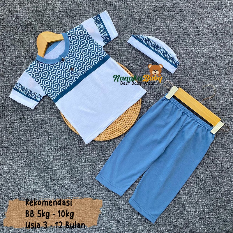 Nanaku Baby - Setelan Koko Bayi Usia 3–12 Bulan Lengan Pendek Kancing Depan Celana Panjang Free Peci Motif Geometris