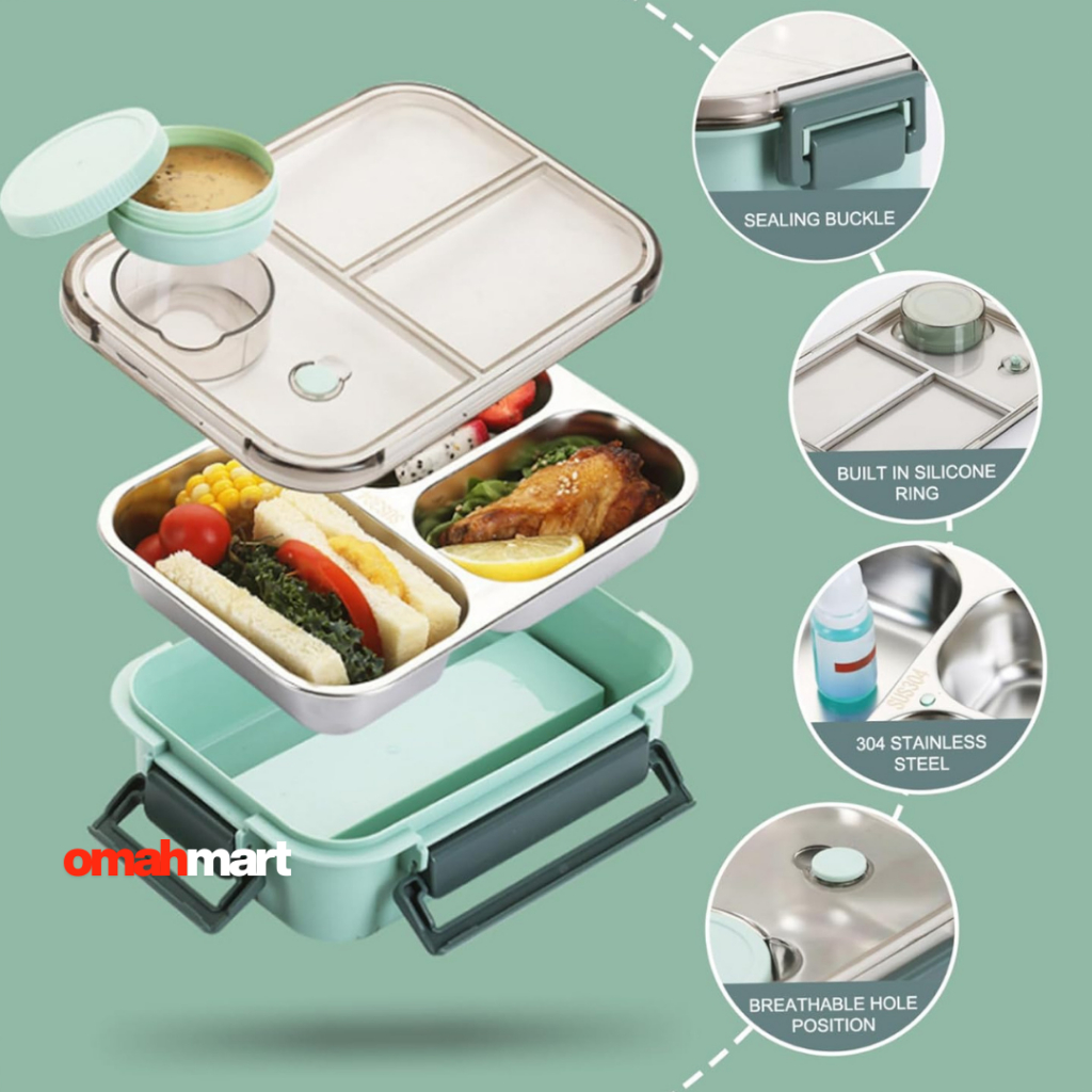Kotak Makan Dewasa Premium Stainless 304 Anti Bocor Lunch Box 3 Sekat Food Grade + Alat Makan