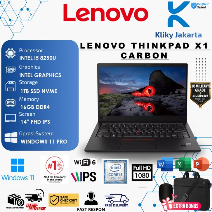 Laptop Lenovo Thinkpad X1 Carbon Intel Core i5-8250U RAM 8GB SSD NVME 256GB 14" FHD Win 11 Second Bukan Baru Murah Berga