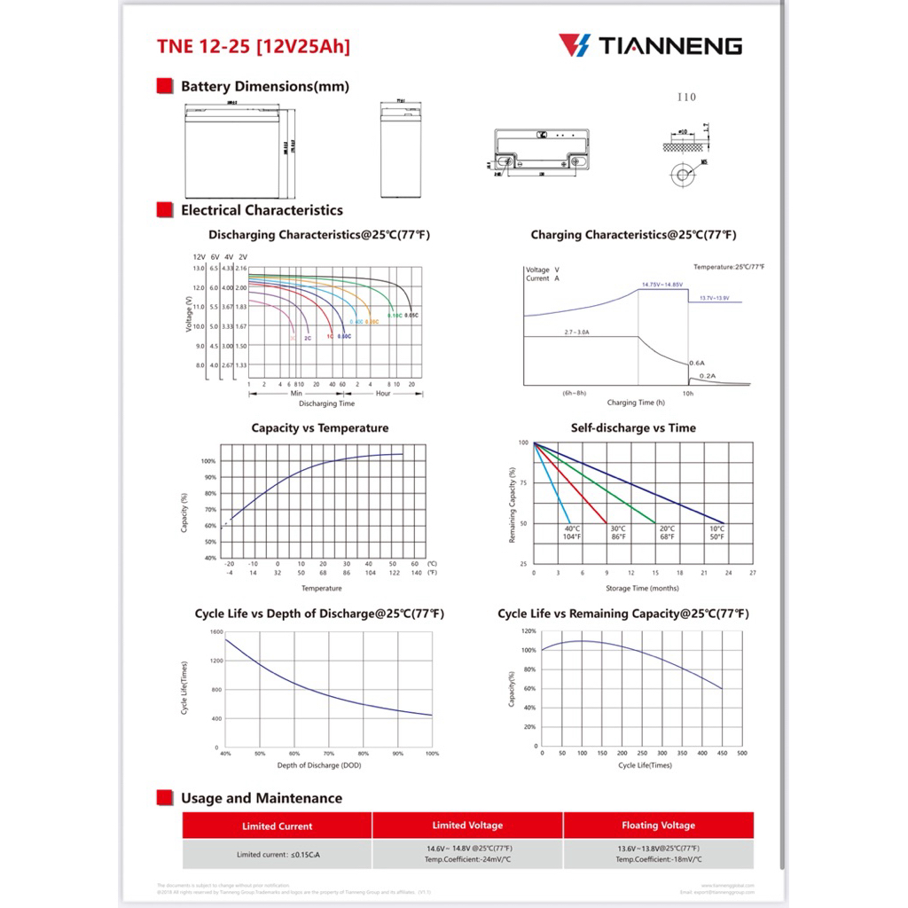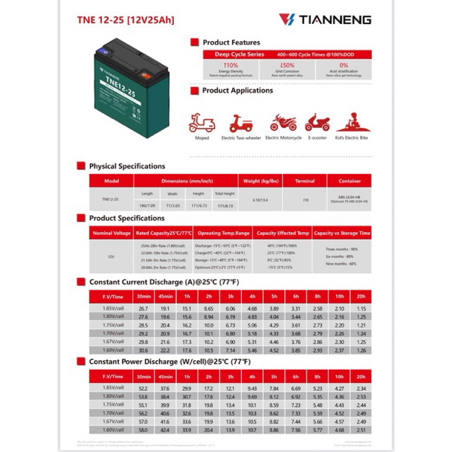 Aki tianneng TNE12-25 12volt 25ah 6dzm20 kepala baut original. Baterai Sepeda listrik / Motor Listrik Deep cycle Tian Ne