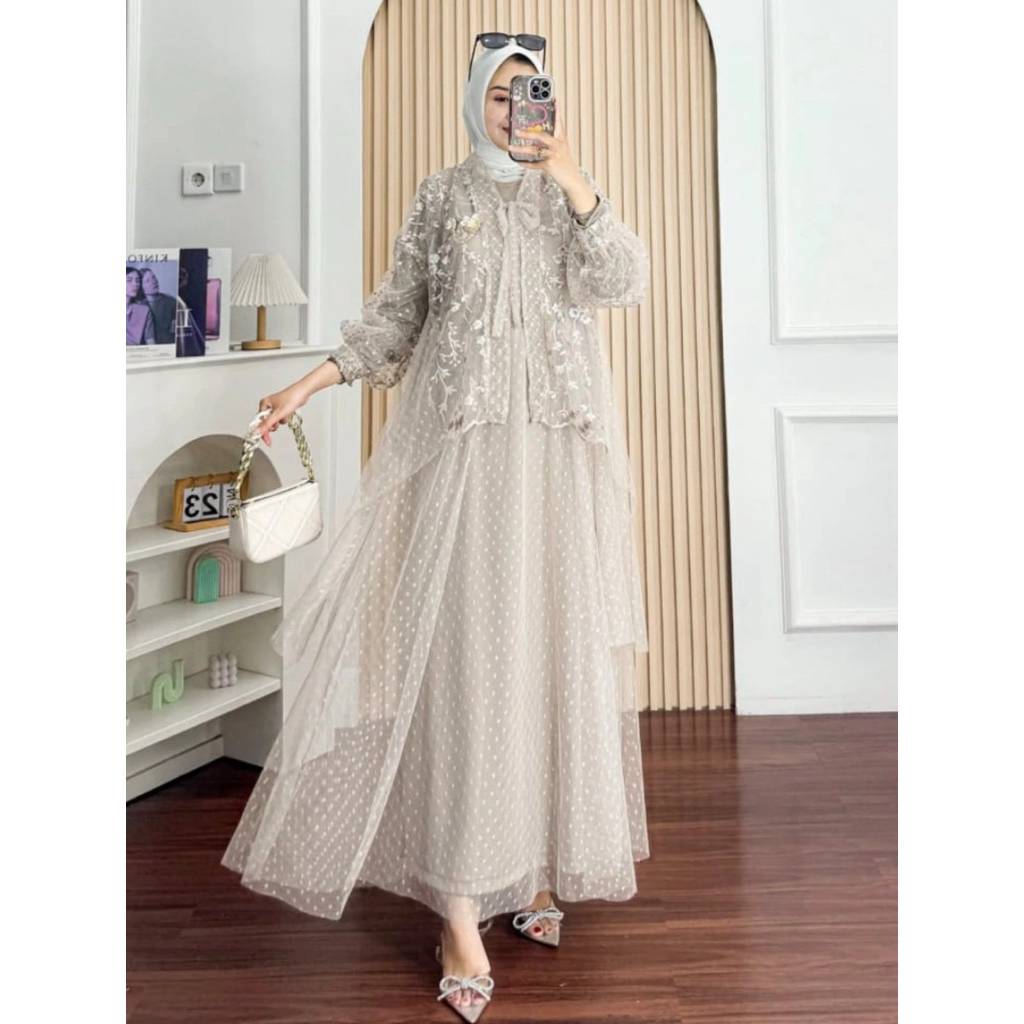 MUTHIA DRESSS GAMIS TRENDY BAHAN JERSEY PREMIUM MIX BRUKAT TILE MEWAH GAMIS LEBARAN TERBARU 2026