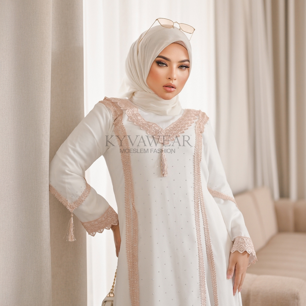 KYVA GAMIS MUSLIM WANITA PUTIH ABAYA RENDA COKLAT TERBARU EDN 019 MEWAH PESTA REMAJA