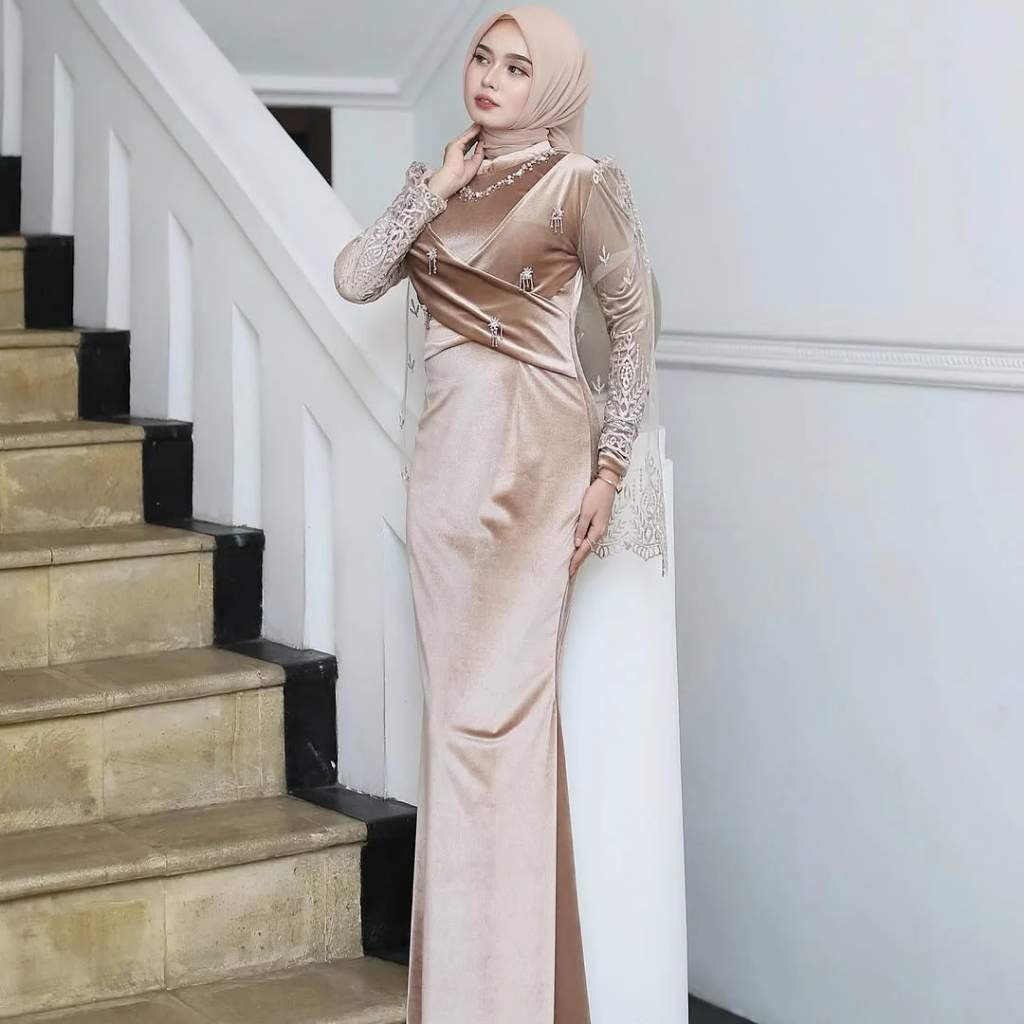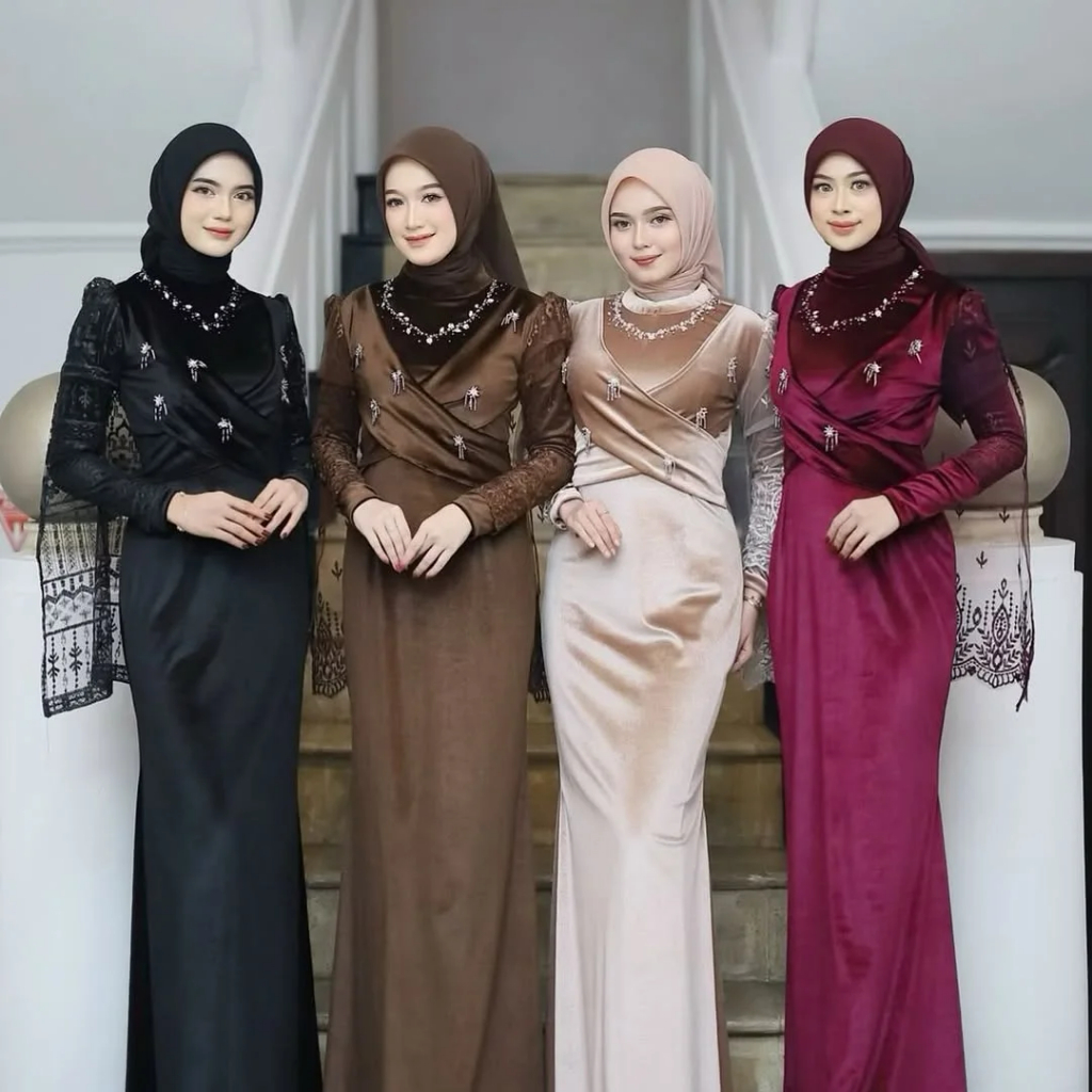 Maria Dress Dress Gamis Lebaran 2026 Model Gamis Terbaru Bahan Velvet Mix Brukat Aplikasi et