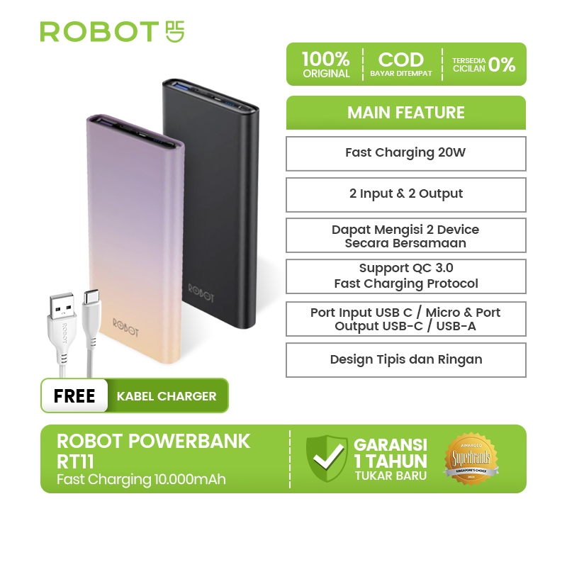 ROBOT Powerbank 10000mAh Fast Charging Ultra Thin, Dual Input Output Type-C & Micro USB, Kapasitas Real Besar, Power Bank Original Hemat & Ringan