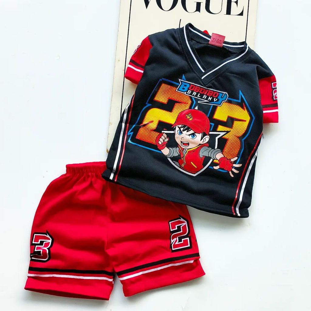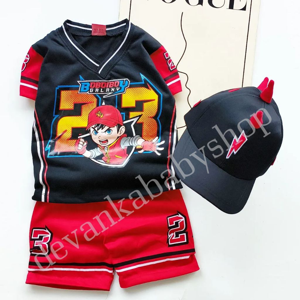 Setelan Boboiboy Anak Laki Laki Baju Anak Cowok Motif Boboi Hitam Merah Bisa Pakai Topi Untuk Umur 1-10Tahun