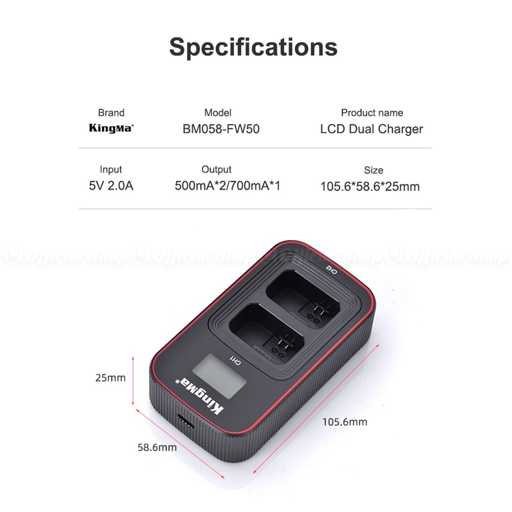 KINGMA LCD DUAL CHARGER NP-FW50 for Sony A6500 A6400 A6300 A6000 A5100 A7R2 A7M2 NEX-7 NEX-6 Etc