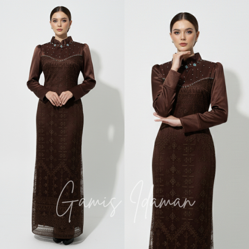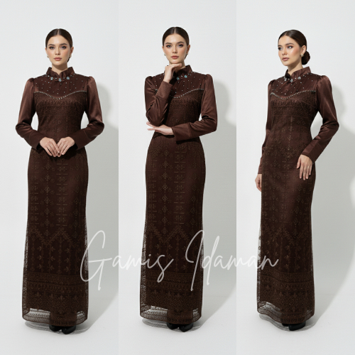[ORI] - LUVITA DRESS LEBARAN MERMAID BRUKAT MEWAH GAMIS SATIN MIX BRUKAT PRESS BODY SPECIAL BURGUNDY MAHOGANY TREND 2026