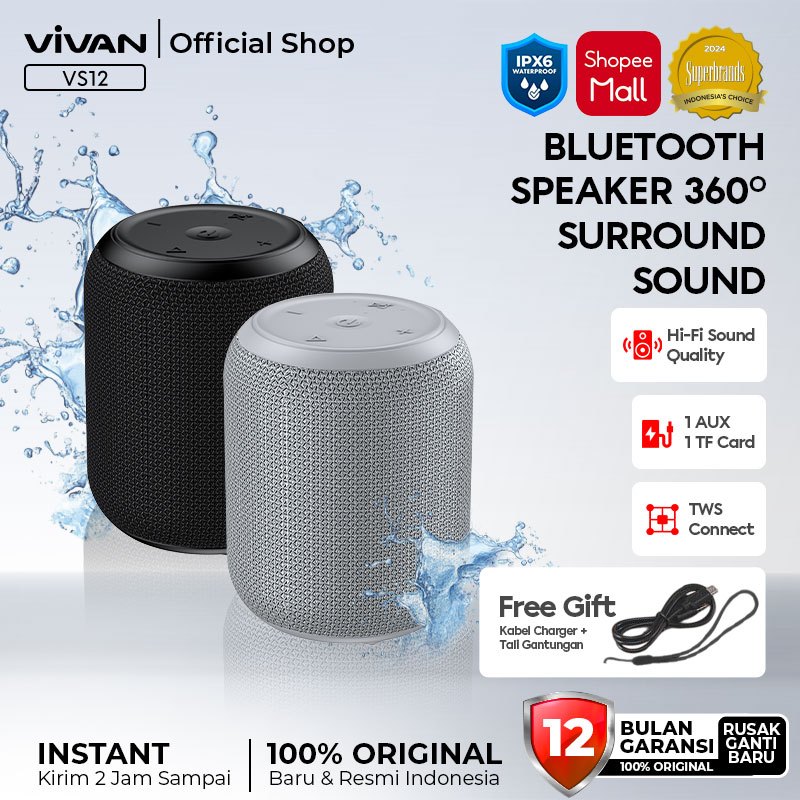 Speaker Bluetooth VIVAN VS12 Portable Mega Bass IPX6 TWS BT 5.0 Surround Sound 360° Garansi 12 Bulan