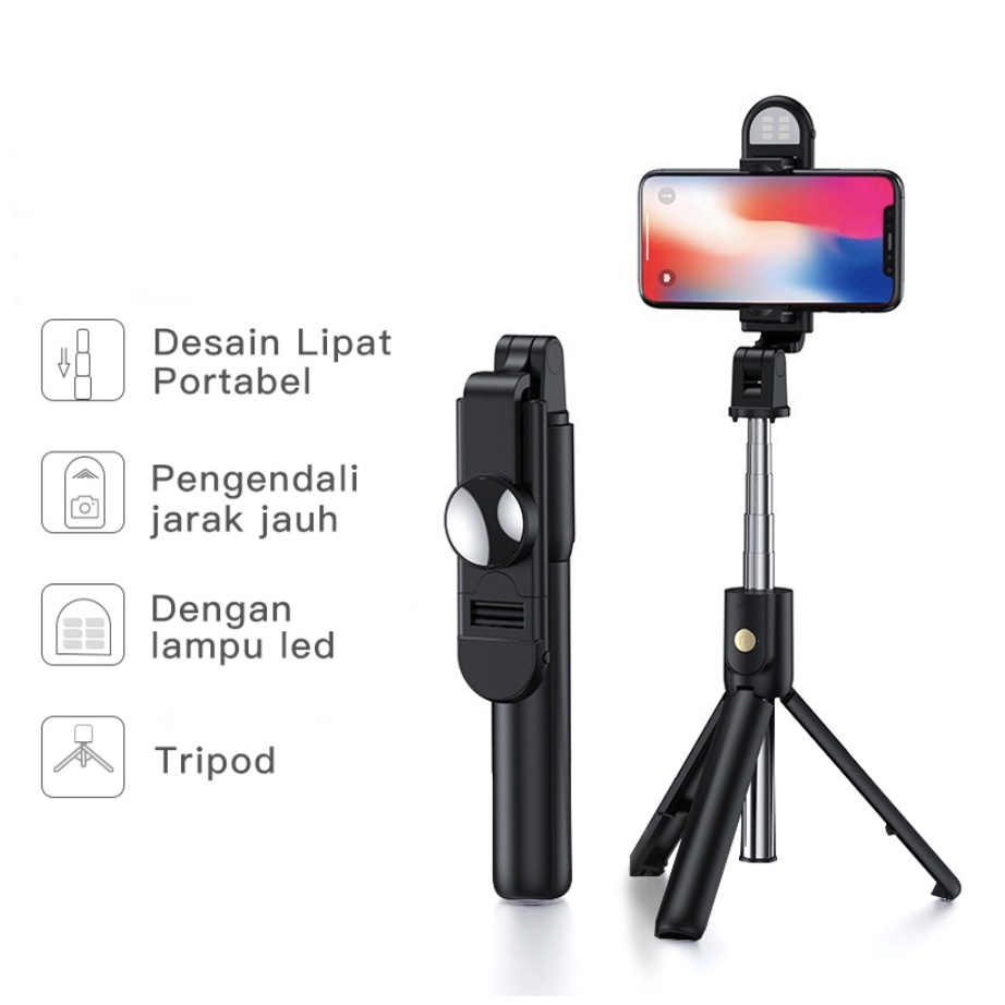 Tongsis Tripod Bluetooth Remote HP Selfie Stick LED Flash Portable Rotatable Expandable 1.7 Meter