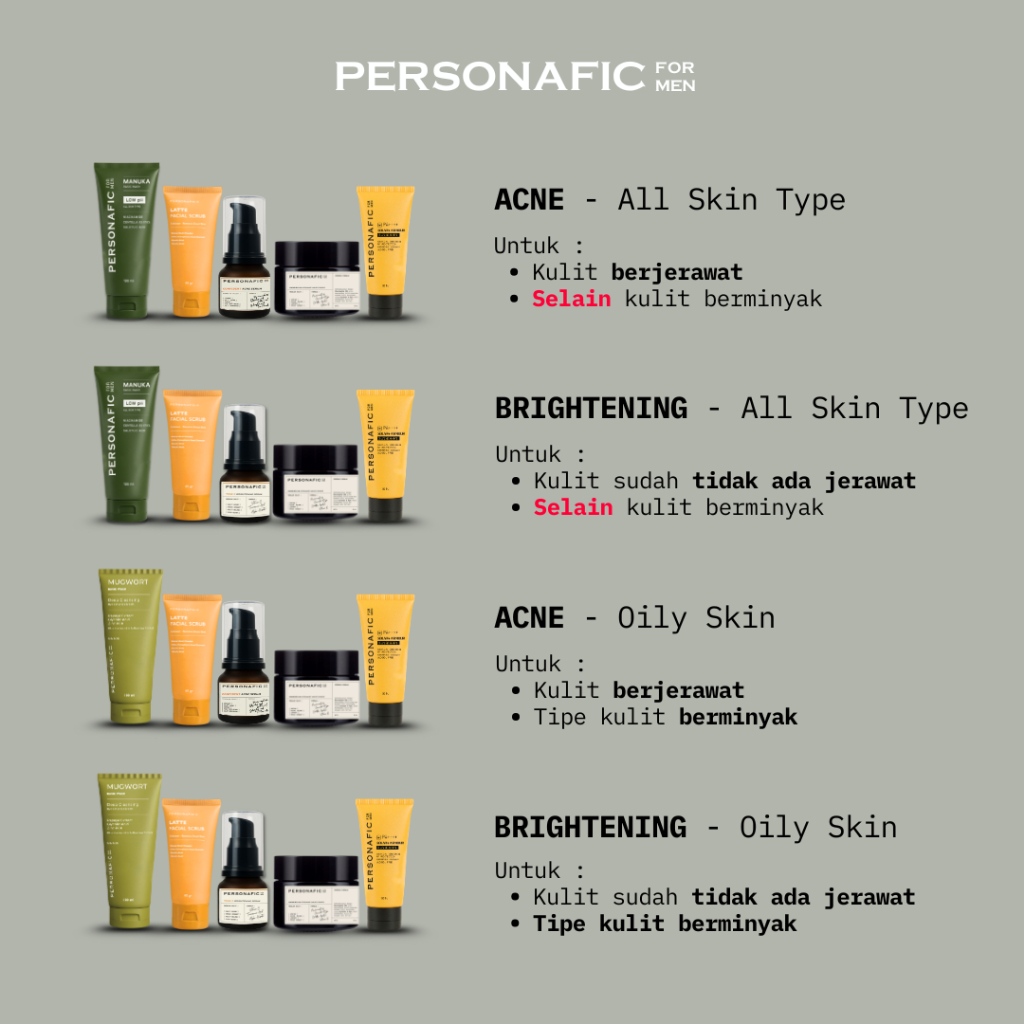 ACNE - All Skin Type, BRIGHTENING-AllSkin, ACNE - Oily Skin , BRIGHTENING-OilySkin, ACNE - BRIGHT , KUSAM - No Facewash, Tone C Brightening Serum, Confident Acne Serum, Solar+ Armour Sunscreen SPF 50 PA++++ 30ml, Ceramide & Niacinamide 10% Moisturizer 50ml, Latte Coffee Face Scrub Eksfoliasi 60ml, Mugwort Deep Cleansing Oily Face Wash 100ml, Manuka Low pH Face Wash 100ml, Pouch Skincare
